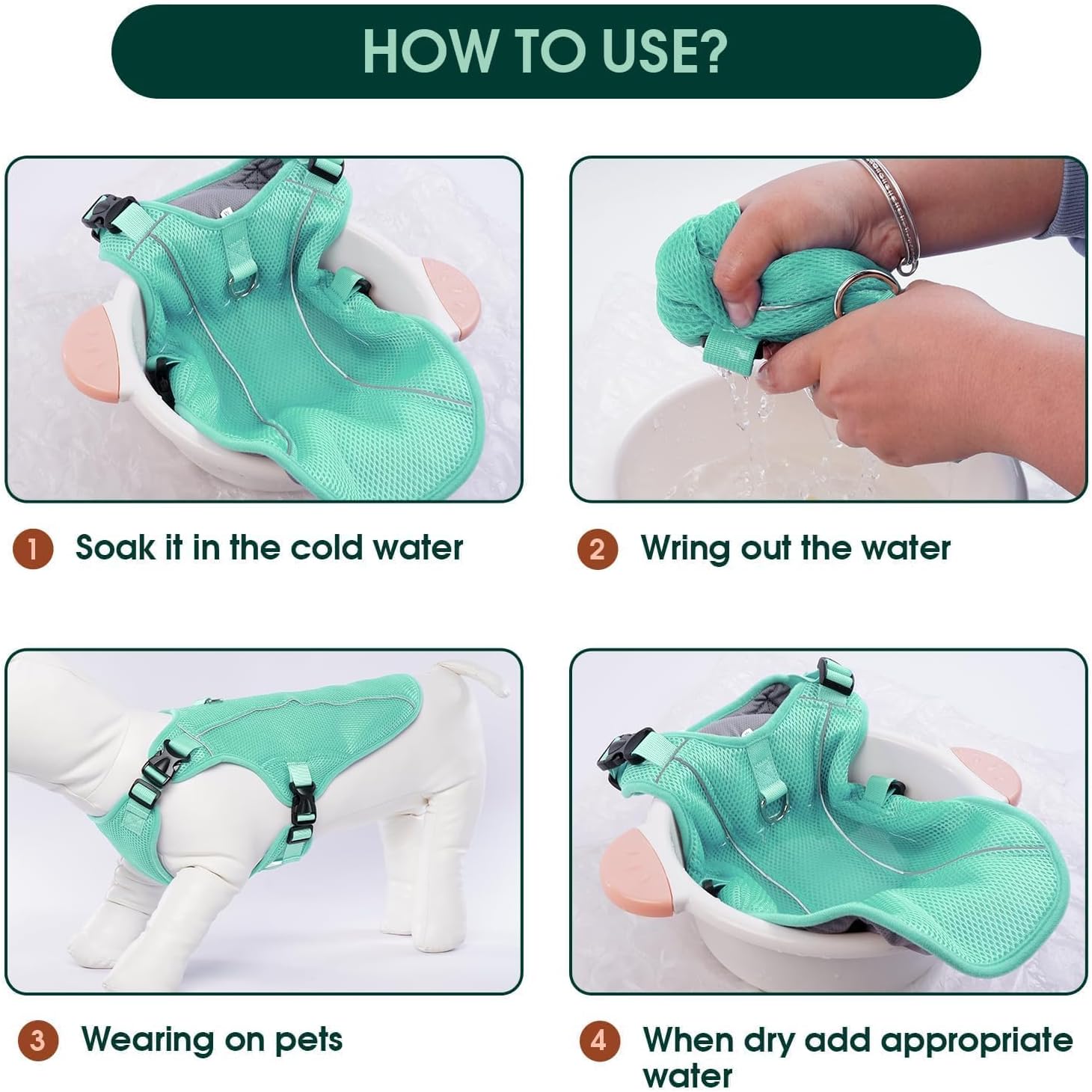 - HOW TO USE: Simply soak the cooling undershirt in cold water, wring it out and put it on your dog. As the vest gradually evaporates, it lowers your dog's body temperature and provides a soothing cooling effect. By using this cooling vest, you can greatly reduce your dog's risk of elevated temperatures and heat-related problems