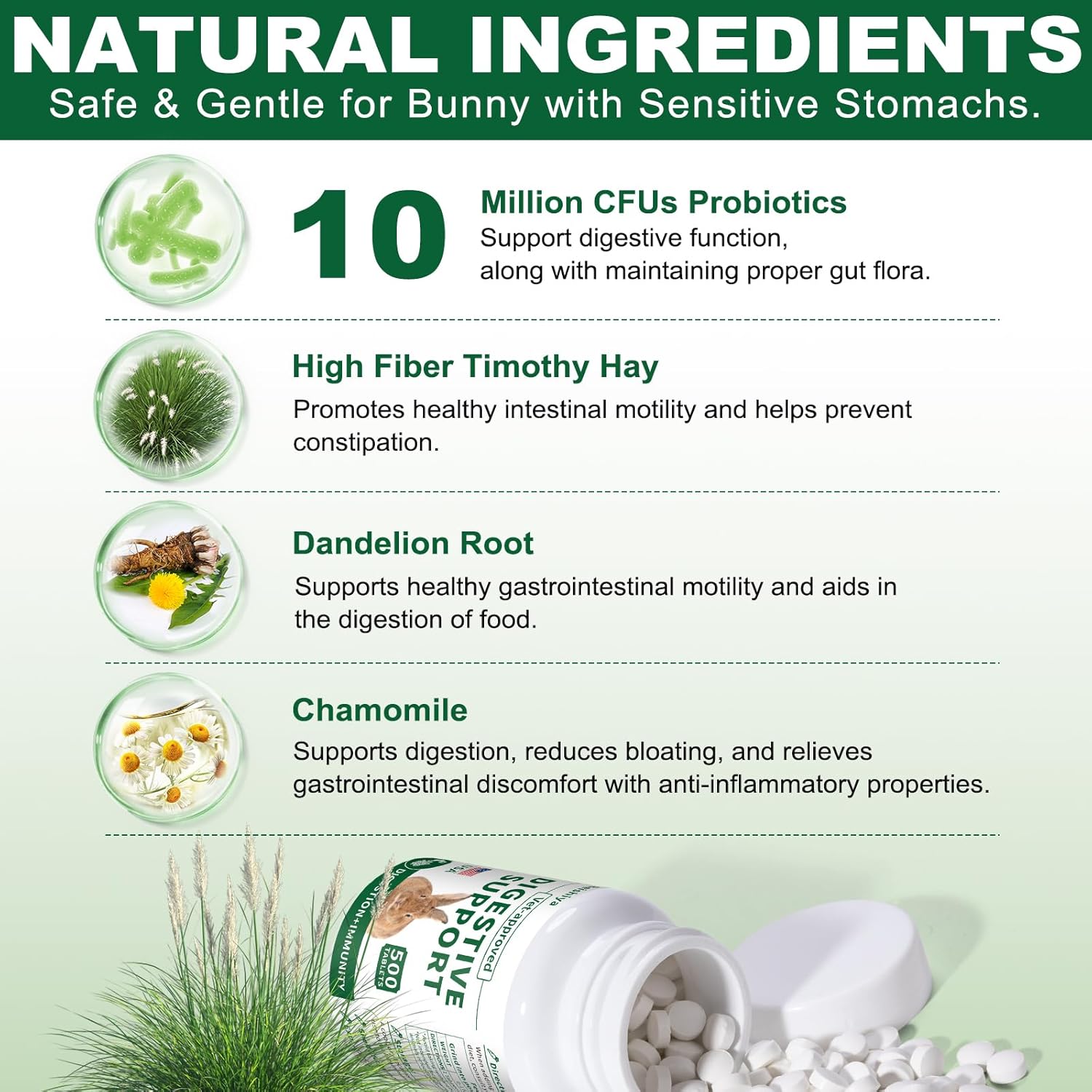 - 500 Tablets of Rabbit Digestive: Each bottle of rabbit digestive tablets contains 500 tablets, providing long-lasting supply that covers your rabbit's needs for several months, reducing the frequency of reordering. With regular use, these digestive supplements for rabbits help prevent and alleviate digestive issues, supporting digestive health