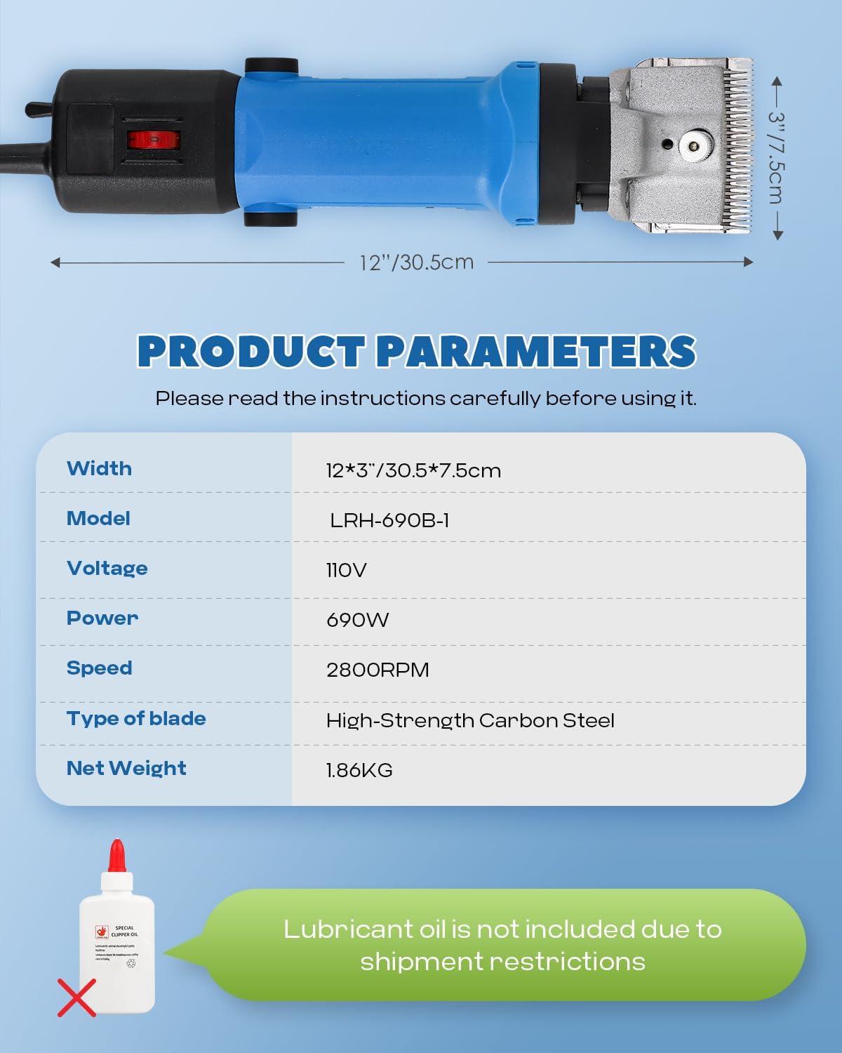 - [PACKING LIST]: 1 x Electric horse clipper ; 1 x Cleaning brush; 1 x Oil bottle (WITHOUT oil); 1 x Blade tool driver; 1 x Extra set of carbon brushes; 1 x Durable carriage case; 1 x Operating manual. PLEASE NOTE: Due to shipment restrictions, the lubricating oil is not allowed to be delivered, please purchase SEWING MACHINE OIL separately, which can prolong the service life of the clipper effectively.