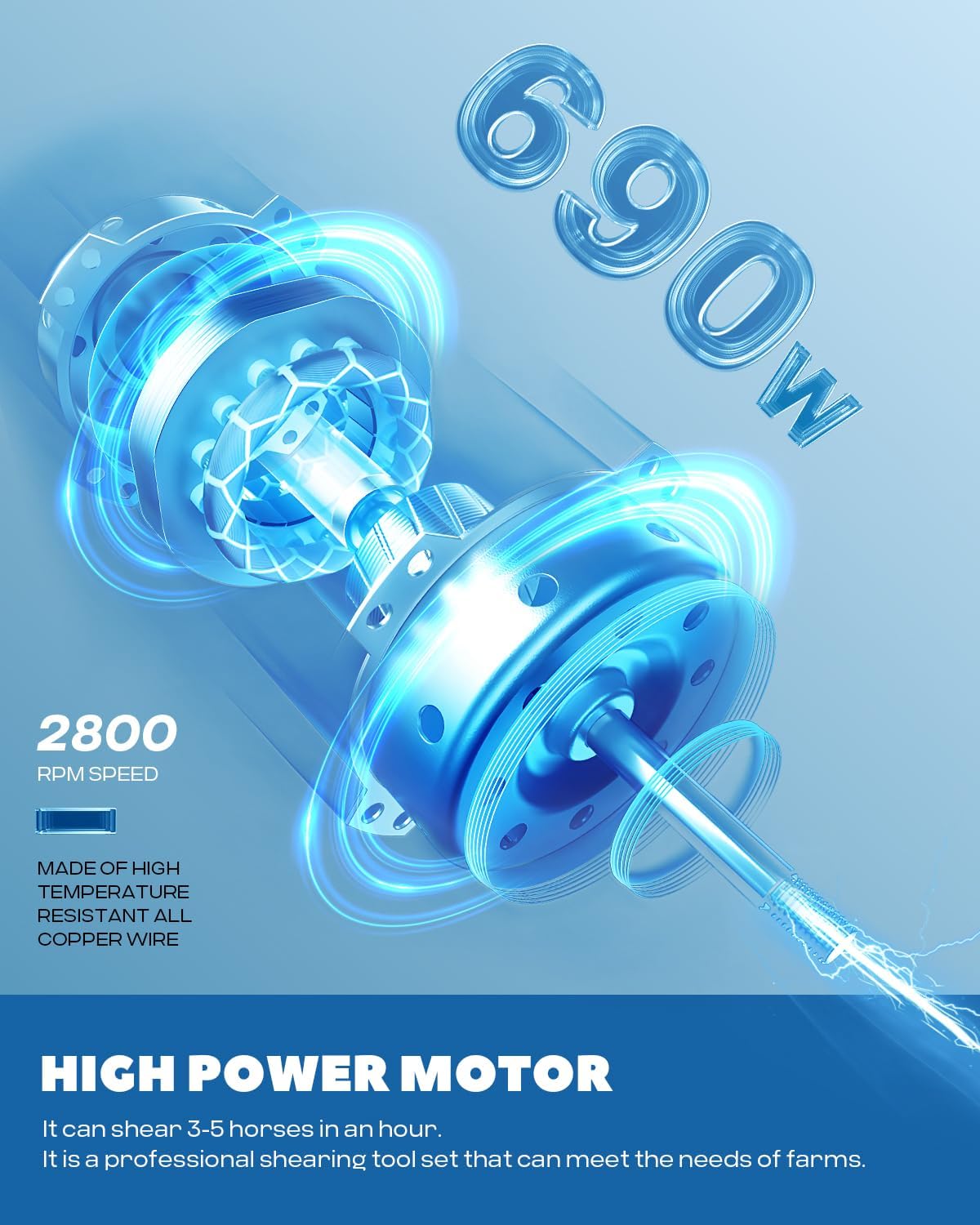 - [690W HIGH POWER]: 690W high power motor made of high temperature resistant all copper wire set with 2800RPM speed, featuring ultra-low power consumption, ultra-high temperature resistance, powerful output and long machine life. Tailored to meet the needs of a farm, this heavy duty horse clipper can handle 3-5 horses per hour, and is versatile enough to trim cattle, sheep, mules, donkeys, and large dogs. For small cats, dogs and other small animals, we do not recommend using this clipper.