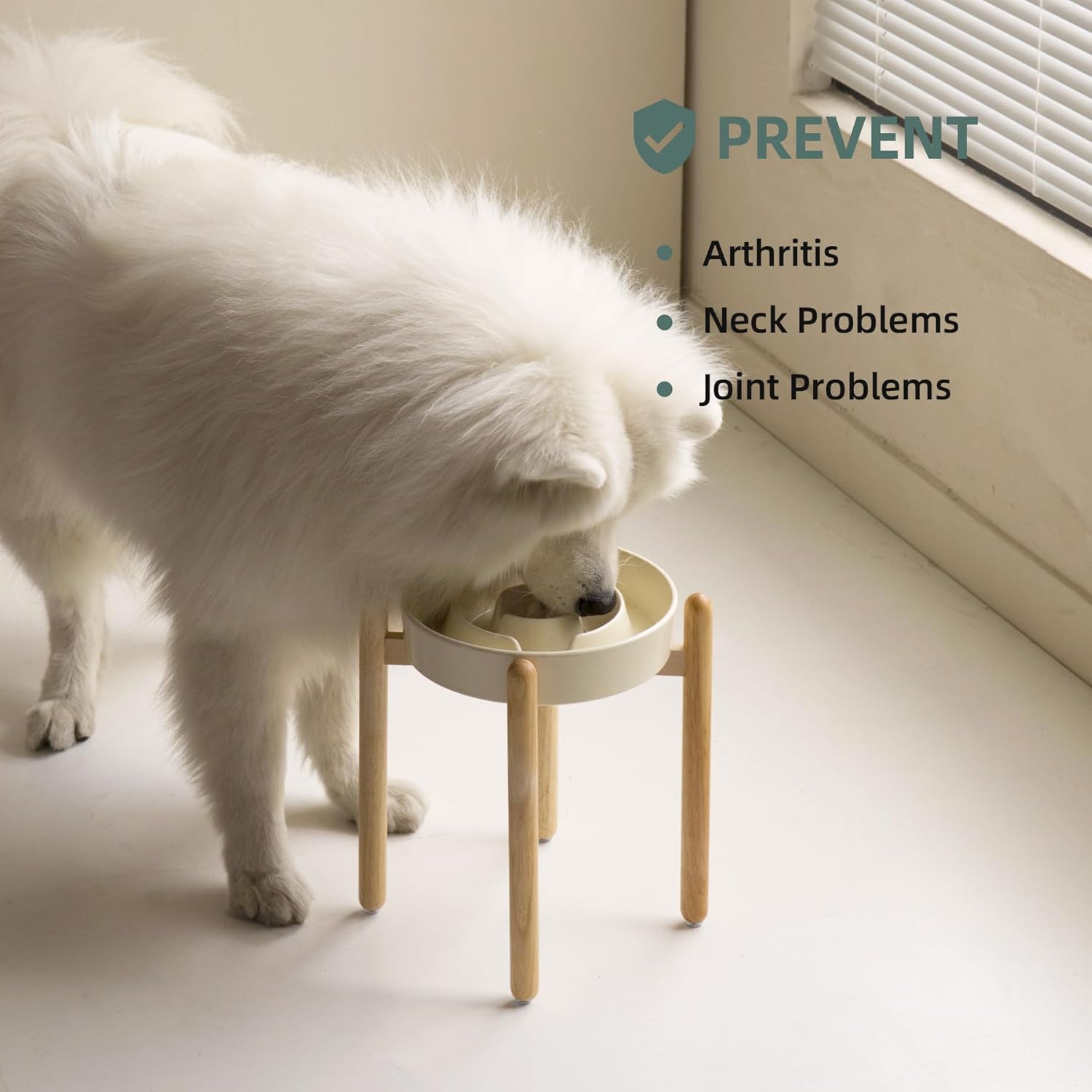 9.5inch Ceramic Raised Slow Feeder Dog Bowl Set, Elevated Bowl with Wooden Stand for Large Dog, Puzzle Slow Pet Food Dish, Anti-Gulping(Beige, Single Bowl+ Stand)