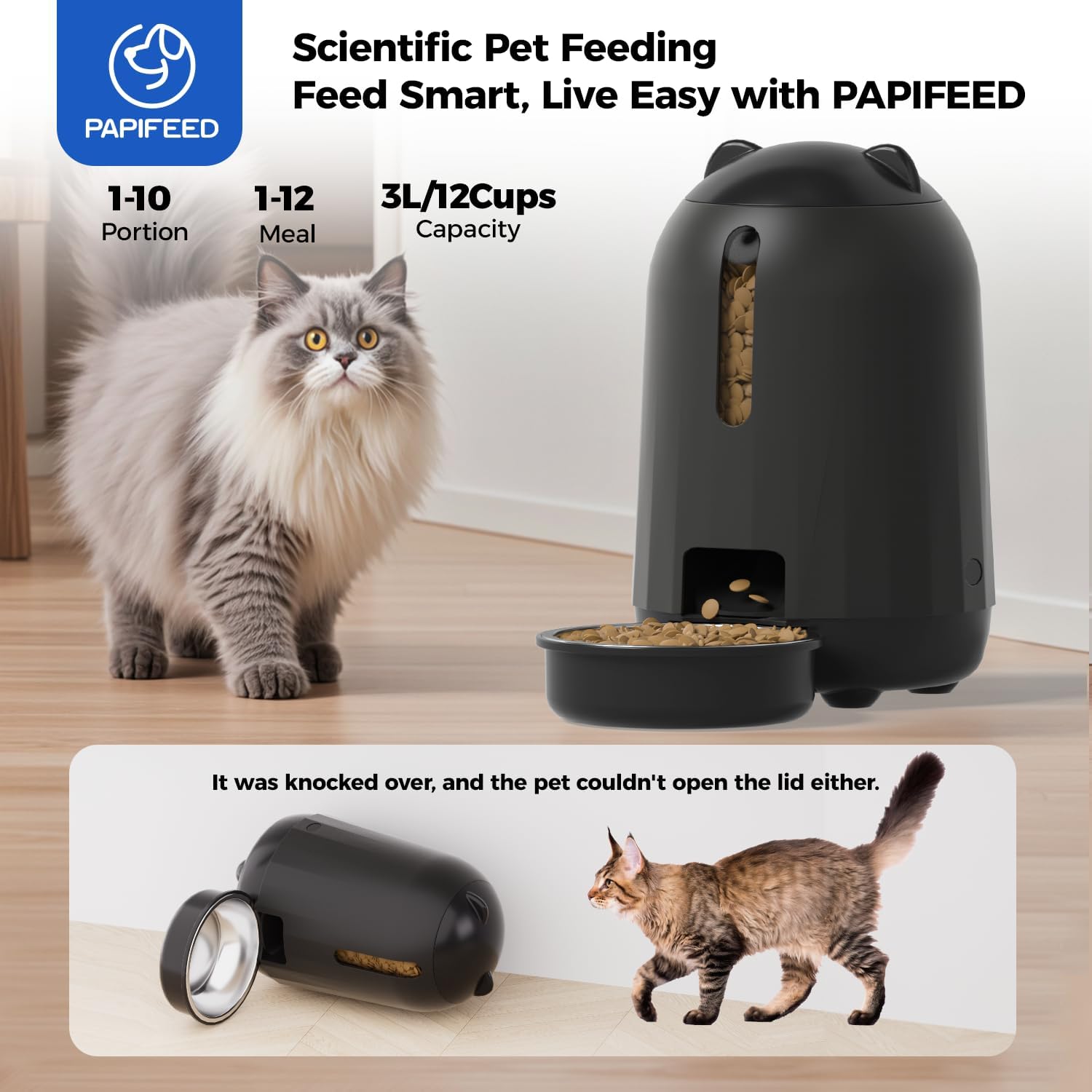 PAPIFEED Automatic Cat Feeder, 3L Timed Cats Food Dispenser with Dual Power Supply, Auto Pet Feeder with Programmable Portion Control for Cats and Small Dogs, Black