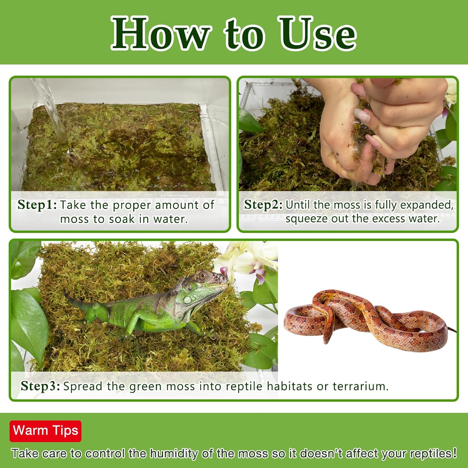 - Natural & No Dyes: This premium reptile moss are all natural, soft and comfortable. There is no offensive highlighter green dye in this green moss. You can use it for your reptiles and plants with ease.