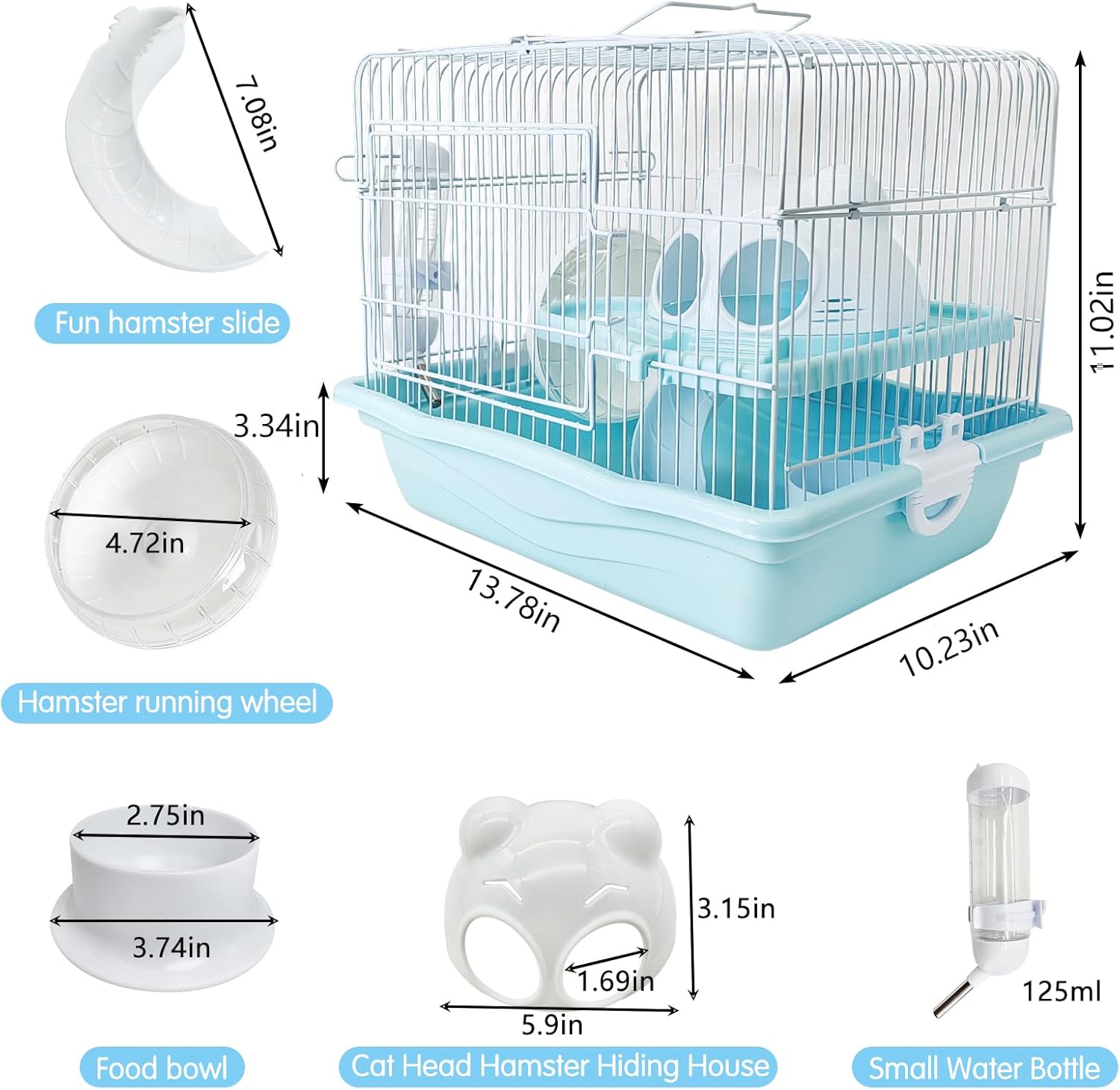 - Hamster cage: Set includes mice cage*1, castle house*1, 2nd floor platform*1, slide*1, running wheel*1, water bottle*1, food bowl*1. The hamster cage has a sturdy structure, which allows you to ventilate the cage and see your pet's activities