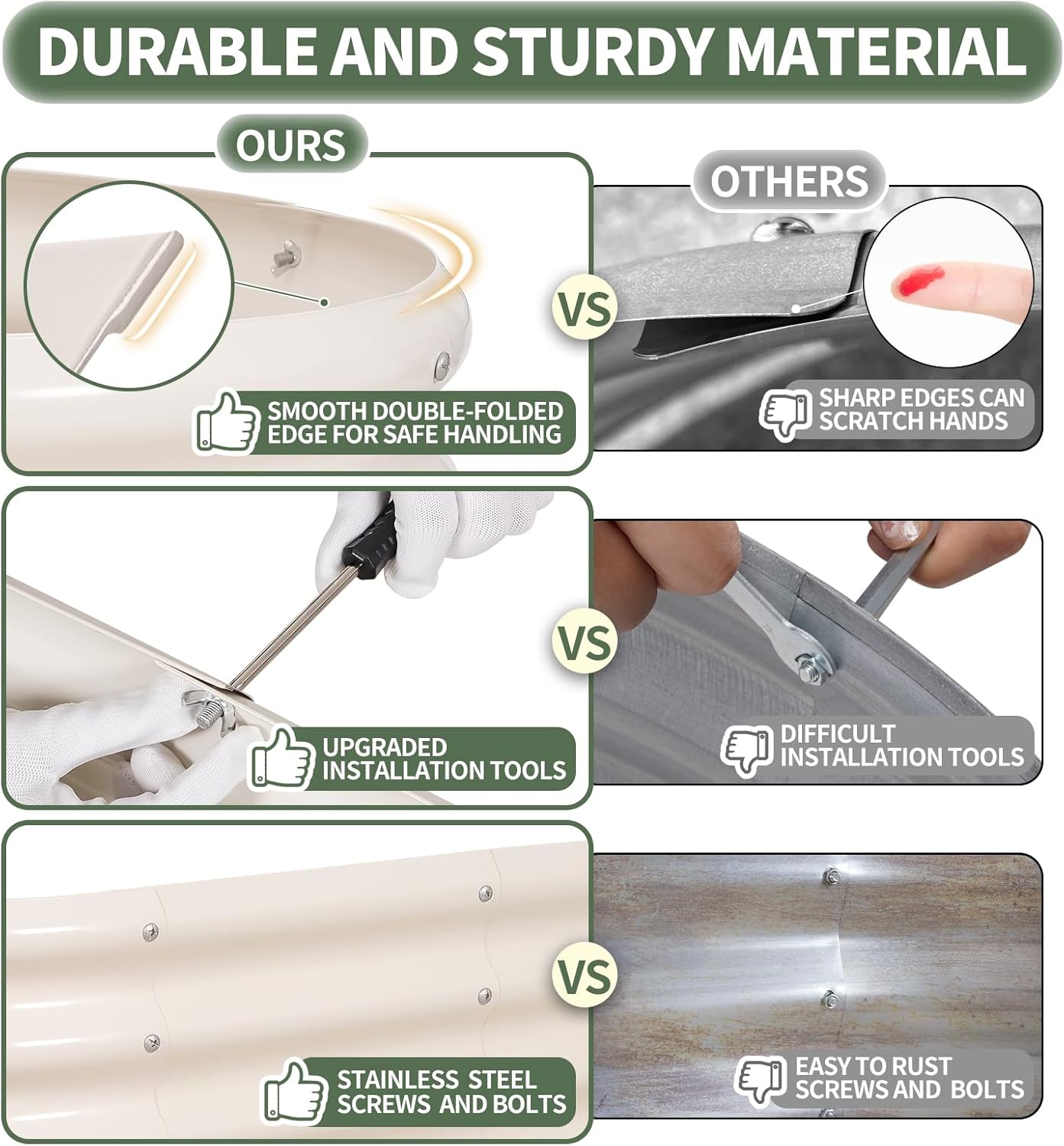 - 【Safety Edge Design & Durable Rubber Strips】The garden bed's top and bottom edges are folded to eliminate sharp edges, ensuring safety from all sides. Rubber strips add extra protection and cushioning, with built-in patches for durability. The galvanized planting box offers the perfect solution for creating your ideal vegetable garden. With the 1More raised bed, enjoy a worry-free gardening experience, prioritizing your safety and convenience. The ultimate choice for a hassle-free and enjoyable gardening experience