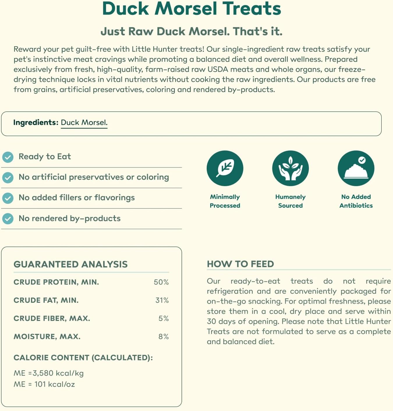 - SINGLE INGREDIENT DOG TREATS: Healthy dog treats made from humanely sourced, pasture-raised, USDA-rated duck – that’s it! Our freeze dried duck morsel dog treats are nutrient-rich to help dogs satisfy their instinctual meat cravings in a healthy way.