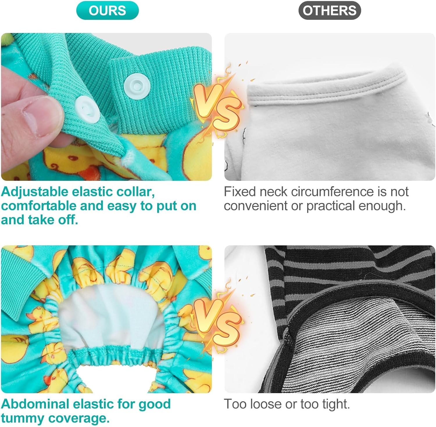 - Easy to Put on and Take off: Our dog pjs are delicately designed with convenient wearing and removal methods. The elastic collar and hidden buttons make it easy for you to quickly put on or take off the pet onesies for your pet