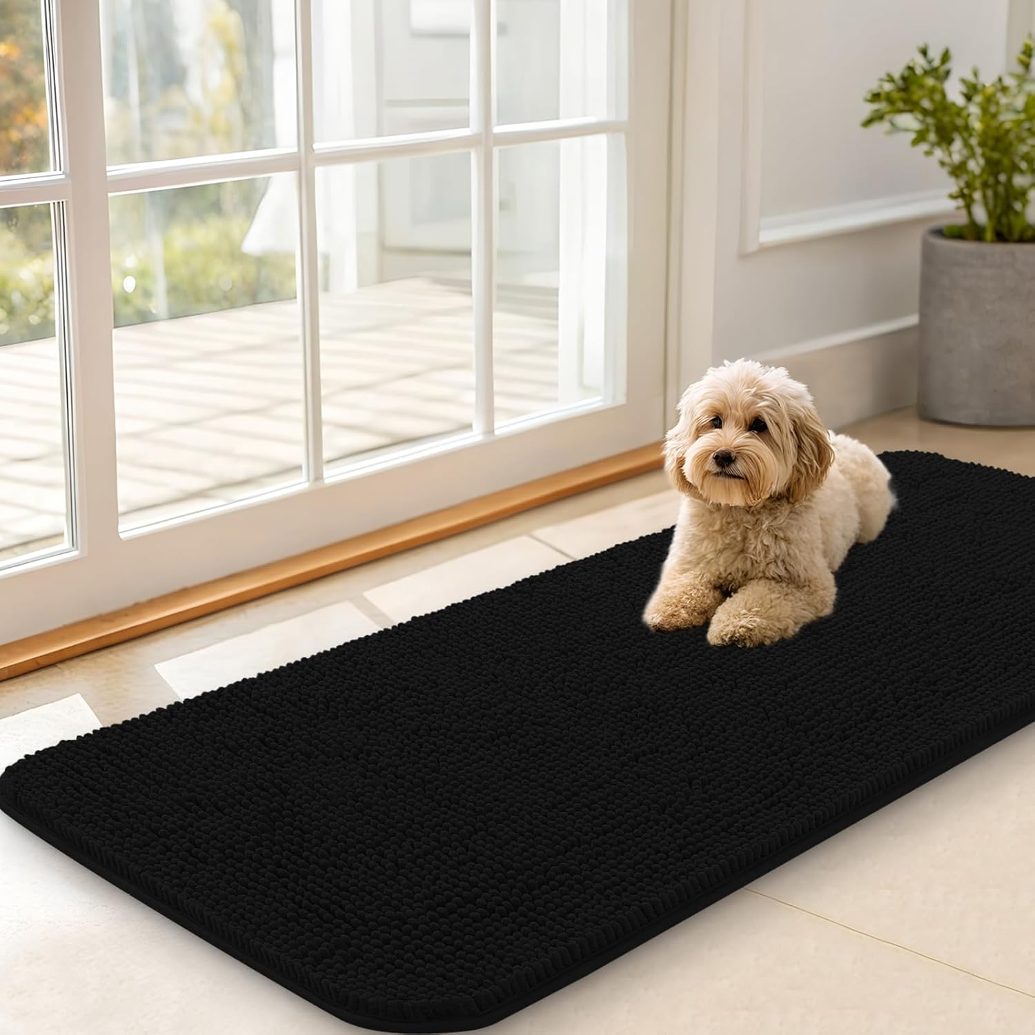 OLANLY Dog Door Mat for Muddy Paws 47x20, Absorbs Moisture and Dirt, Absorbent Non-Slip Washable Doormat, Quick Dry Chenille Mud Mat for Dogs, Entry Indoor Entryway Carpet for Inside Floor, Black