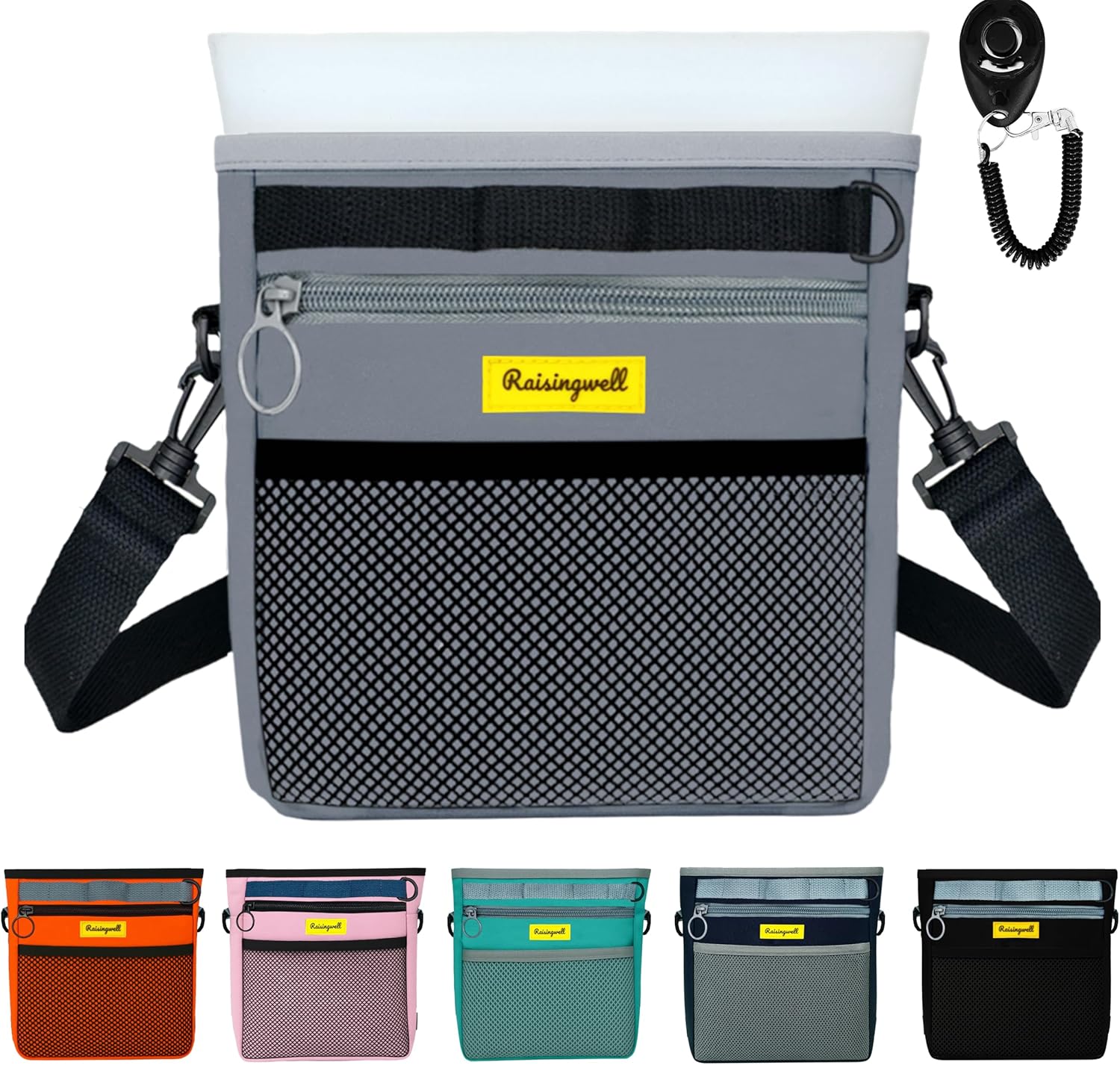 - 5.Durable Tech Material: Raisingwell's dog treat training pouch is made from durable, washable, and non-toxic fabric. Notably, its waterproof lining solves the problem of difficult-to-clean interiors of training bags, making it a great choice for your dog treat bag or dog treat fanny pack.