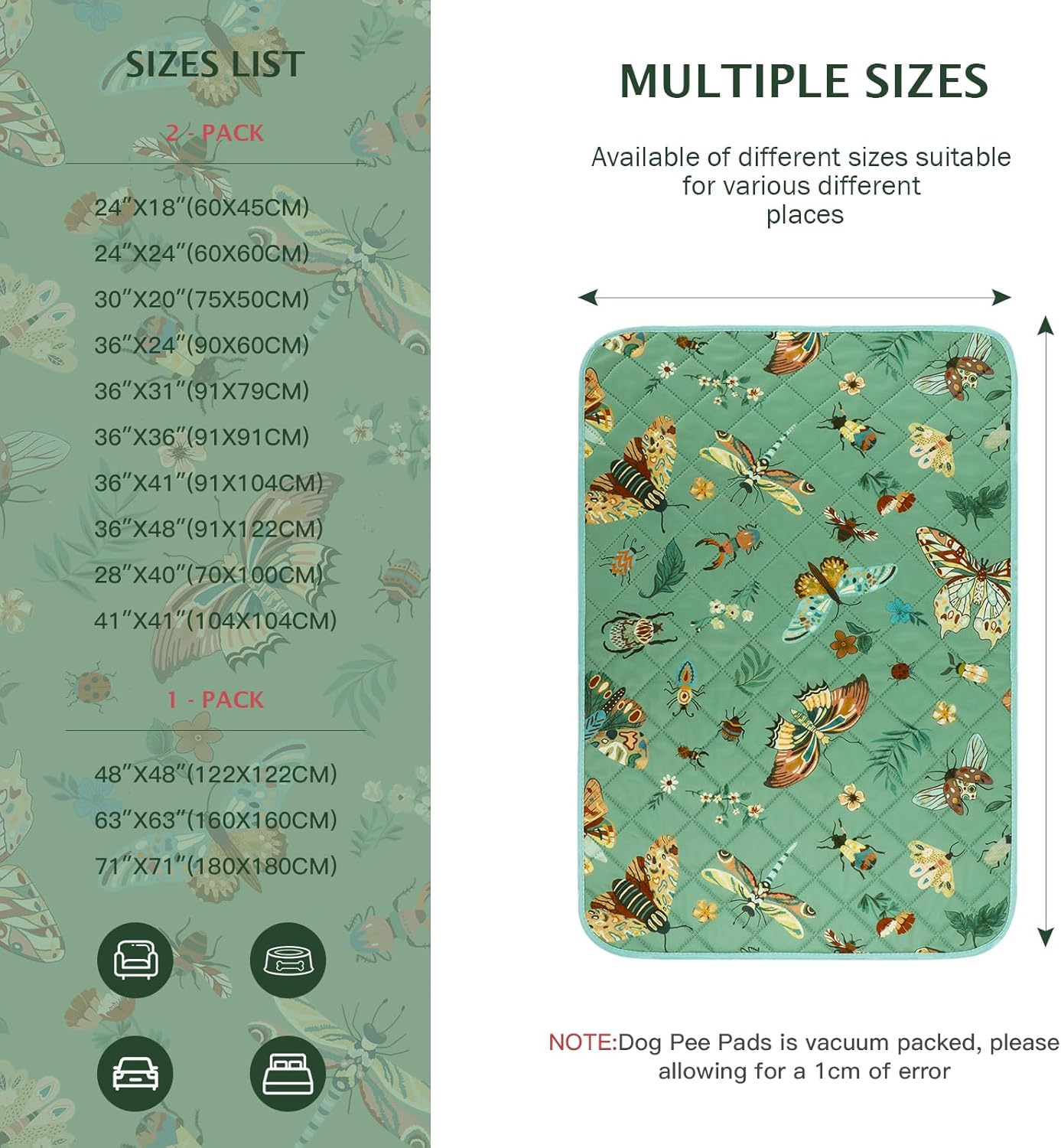 IEUUMLER Washable Pee Pads for Dogs, 2 Pack Insect Pattern Reusable Waterproof Puppy Potty Pads, Non-Slip Absorbent Pet Training Pads for Playpen Crate Bed EU014