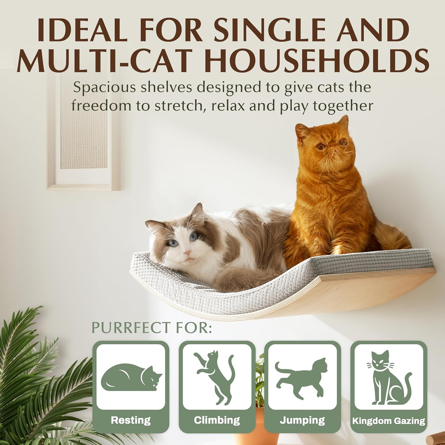 - HIDDEN MOUNTS & MINIMALIST STYLE – The floating cat shelf maximizes space while blending seamlessly into any home. Its hidden mounts and screws create a modern, minimalist look, making it a stylish addition to any cat climbing wall or wall-mounted cat furniture setup.