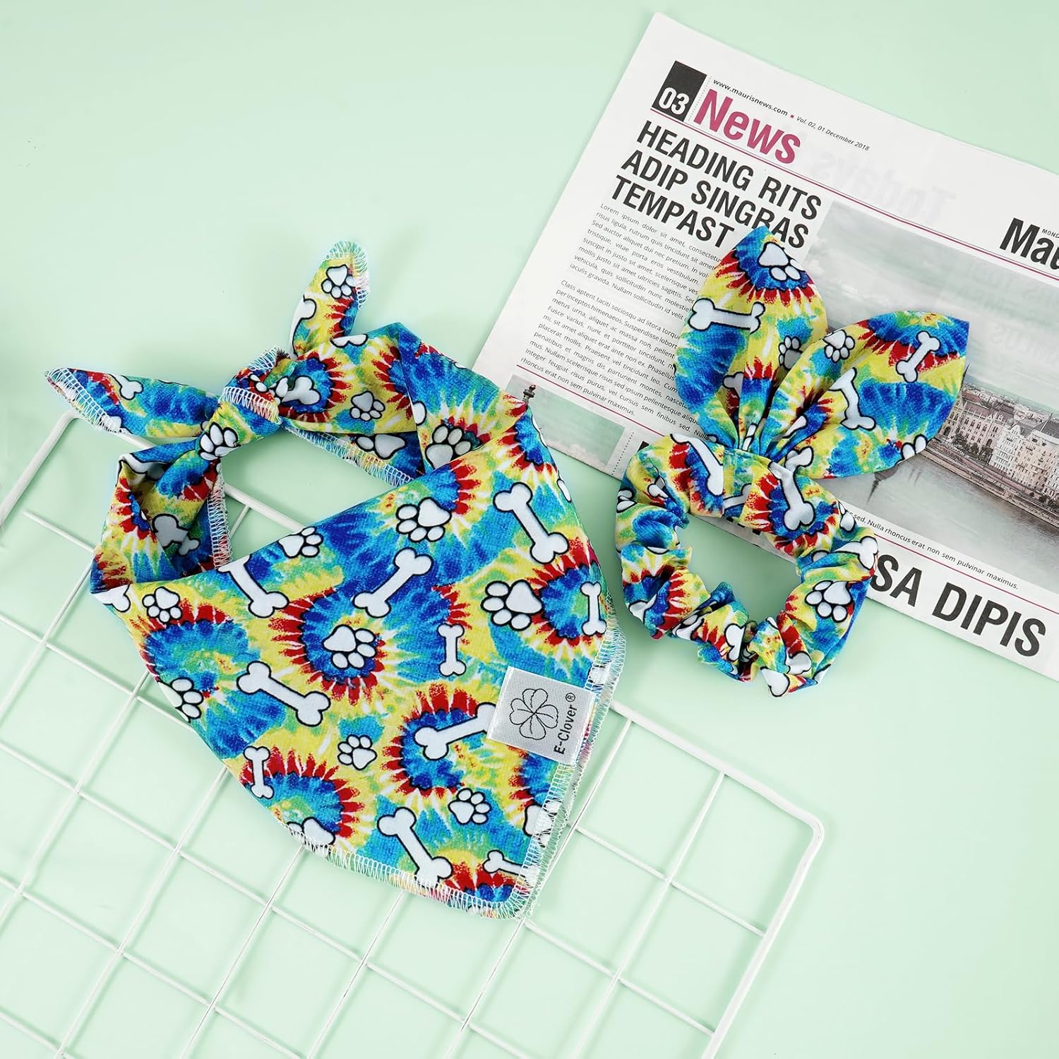 E-Clover Dog Bandanas Boy & Matching Scrunchie Set Girl Cute Rainbow Dog Scarf Bibs Pet Bandana with Bow Tie for Medium Large Dogs Owner Mom Pride