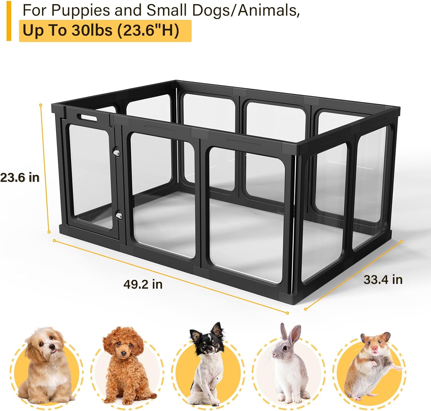 - 【Spacious Design】With dimensions of 33.4in L x 49.2in W x 23.6in H and 10 panels, this clear dog play pen provides ample space for your pets to move around comfortably. The spacious design ensures they have plenty of room to play and explore.