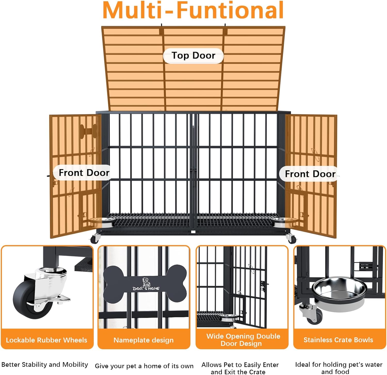 - 【Easy Access & Feeding】Each dog crates has double doors and a reversible top for easy access to almost anywhere. The top is open. The kennel also has two small feeding doors with locks. These doors allow quick and easy access to stainless steel dog bowls, swinging bowls without having to open the front door for easy feeding. The two-door design of the kennel is not only easy to enter and exit the kennel, but also easy for you to interact with and feed your dog. This crate has multiple ways to open the door, so you can try agility and obedience to make them grow faster.