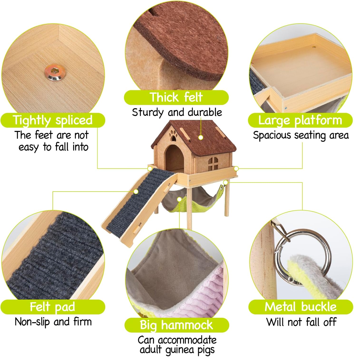 - 【NATURAL WOOD & THICKENED FELT】Our guinea pig cage accessories are made of natural wood.Not only are they durable,but they are also safe for your furry friends,ensuring they can enjoy activities without worries.The thickened felt is sturdy and not easy to break,and the included pet hair can be easily removed with the lint roller.