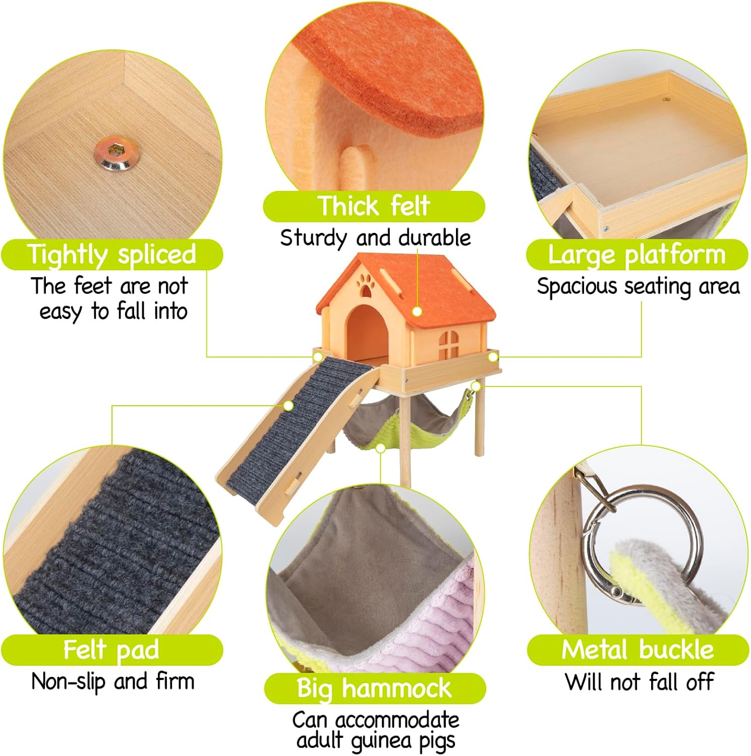 - 【3 IN 1 MULTIFUNCTIONAL DESIGN】Hammock+Platform+House.This guinea pig toys uniquely combines a hammock,platform and house together to provide your piggies with multiple ways to move around.The perfect blend of hiding,sleeping and playing can promote a happy and healthy lifestyle for your piggy.Effectively saves the space in guinea pig cage and cost of guinea pig accessories.