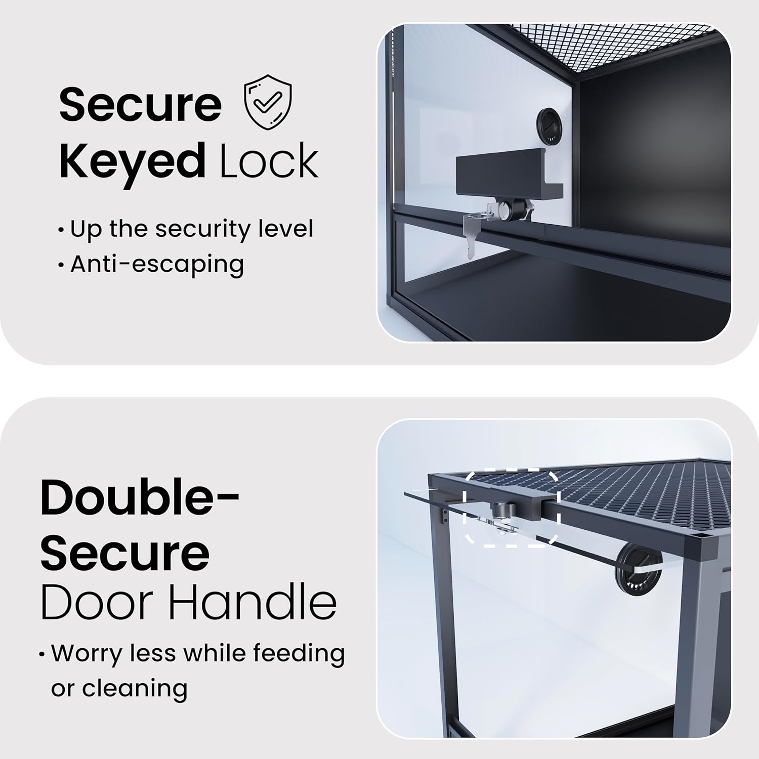 - ăLock IncludedăA tempered glass door with a safety keyed lock to prevent escape and accidental opening by others. NO GAPS FOR ESCAPING with fully closed structure. Rigid tempered glass doors for extra safety.