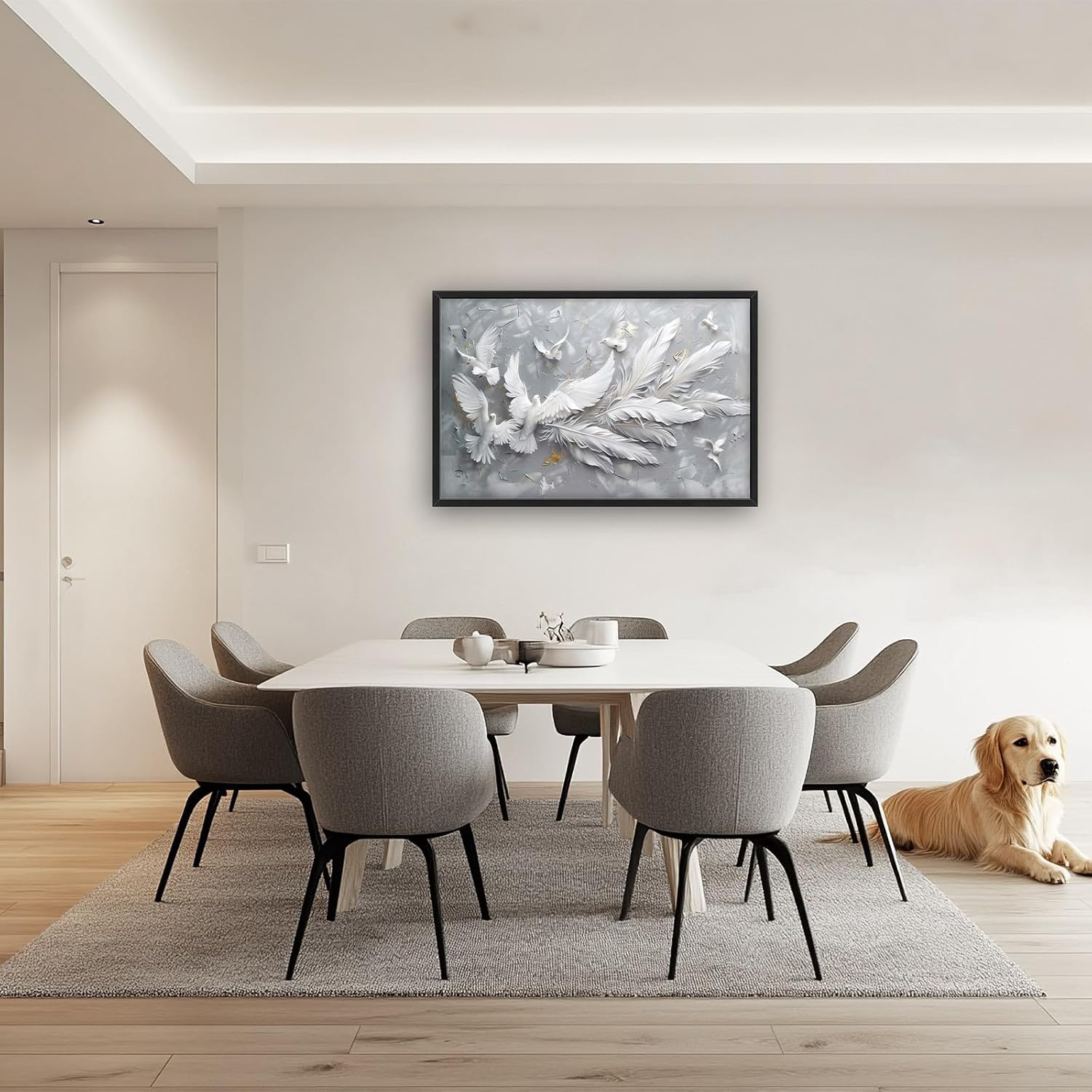 - 【Unique Design】3D abstract painting of white doves with long feathers, flying in the air. The background is gray and textured. There should be no shadows on it. In front, there will also be other light-colored birds, and they can have different shapes. Together, they form an artistic composition that symbolizes peace or freedom. White feathers on wings, full-length, high detail.