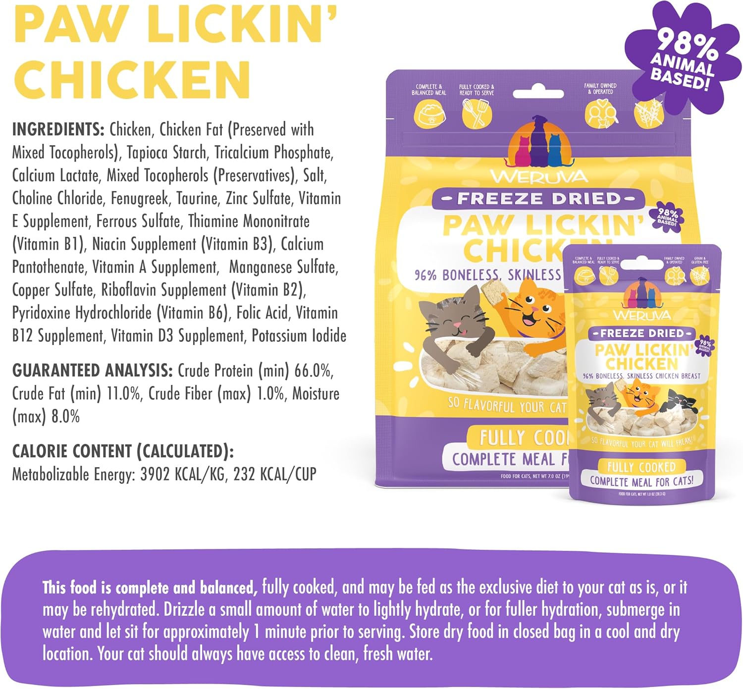 - Weruva Cat Freeze Dried Paw Lickin' Chicken, 7oz Bag. Gently cooked boneless, skinless chicken breast with healthy fats and fenugreek. No bones or organs