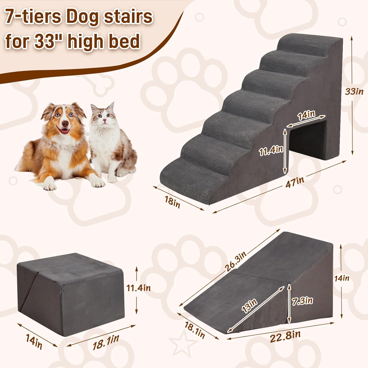 - 33inches Height Bed Stair for Dogs and Cats: The height of our steps is the highest on the market currently ,the size of the pet foam ramp is 47 x18 x 33in, this pet step for small dogs helps access beds or couches of up to high bed ,high density memory foam makes it ideal for the small to medium breeds, and the silicone paw print on the bottom makes it more stable so the puppy can climb up and down without falling. We recommend the pet ladder for pets under 60 pounds
