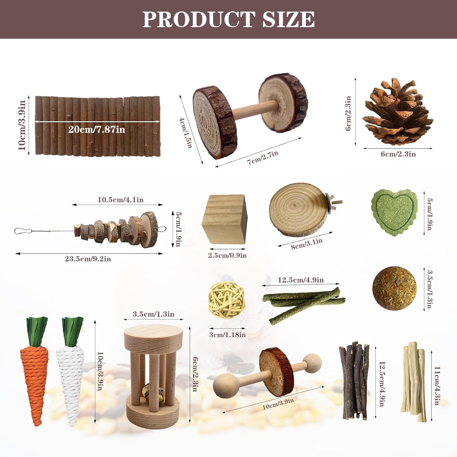 - 【Hamster chew toys sets】Our hamster chew toy set includes: 1* apple branch molar skewer, 4.1*1.9in. 1* bendable wooden bridge, 7.8*3.9in. 1* unicycle, 3.9*1.7in. 2*Rattan ball,1.1in. 20g apple twig,4.7in. 3*grass stick,4.9in. 1*Bell Roller,2.4*1.4in. 2*Grass Carrot Toy,3.9in. 50g* sweet bamboo, 4in. 1*timothy hay cake,1.4in. 1*timothy hay ball teeter,1.9in. 1* chinese pine,2.3*1.9in. 1* Wooden Dumbbells,2.7*1.5in. 1*Round Wooden Standing Platform,3.1in. 2*Wooden molar blocks,0.98*0.98in.