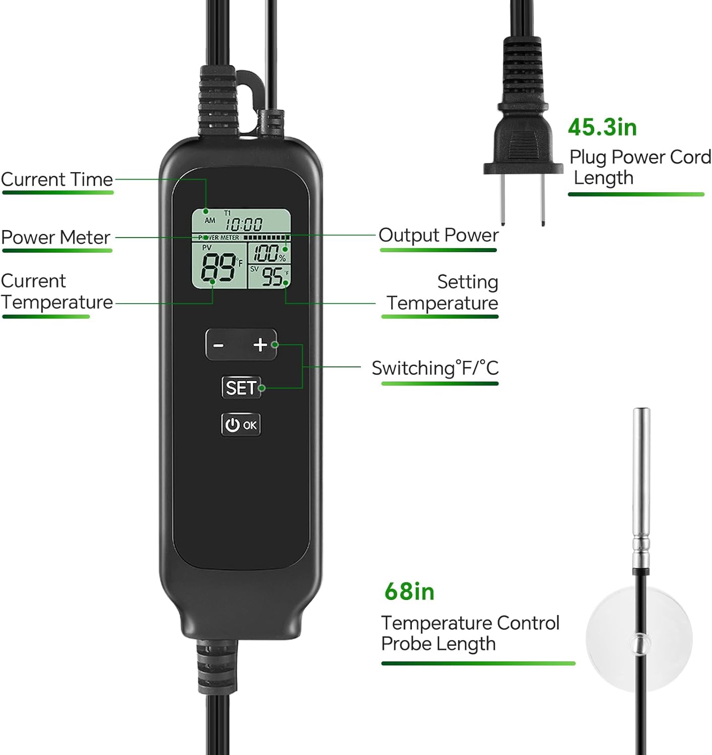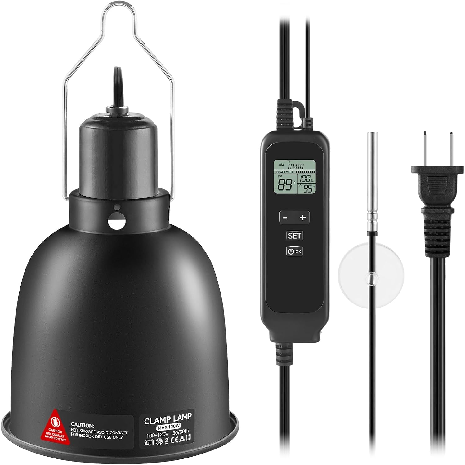 - Easy To Use : This digital temperature controller of snake heat lamp is easy to set up and operate. Simply place the temperature probe in the desired location inside the reptile enclosure, plug in the power supply and set the temperature. The dual-zone LCD digital display shows real-time time, ambient temperature, setpoint and output power, so you can monitor the temperature output more intuitively. Support Celsius and Fahrenheit temperature free switching.