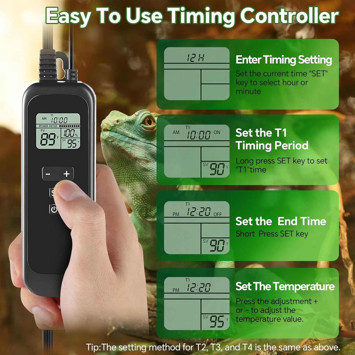 - DIY 4 Time Periods & 24h Temp Control: Our reptile lamp fixture with thermostat combines timing and temperature control in one, allowing you to set any time of the four independent constant-temperature zones for day and night. It perfectly mimics the natural environment, helping you precisely manage your pet's lighting and heating schedules. The reptile dimming thermostat features a daily cycle function that automatically repeats every day. It's perfect for all types of reptile tanks, reptile terrariums and reptile cages.