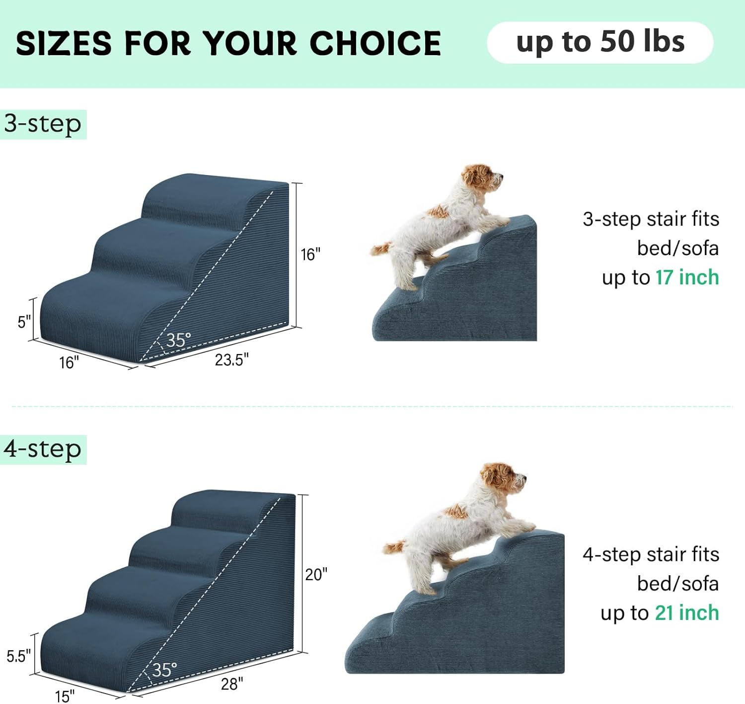 - 【Multiple Stairs Size to Choose】TWO-STEP: 15.7"L*16.5"W*11.8"H, THREE-STEP: 23.5"L*16"W*16"H, FOUR-STEP: 28"L*15"W*20"H. It's a dog stair for most high beds, couch and sofa.