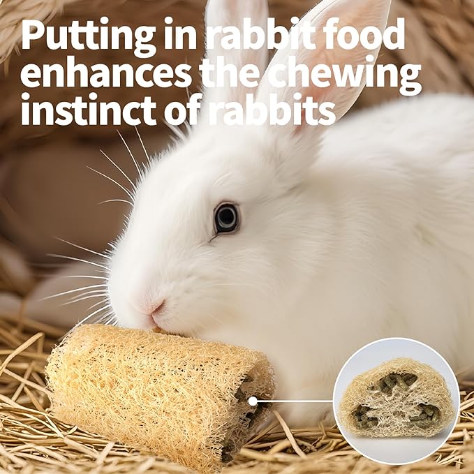 - 【100% EDIBLE TOYS】Fill the rabbit food with loofah,by chewing on this toys,can slow down the overgrowth of teeth and keep your small pet's teeth clean and healthy.