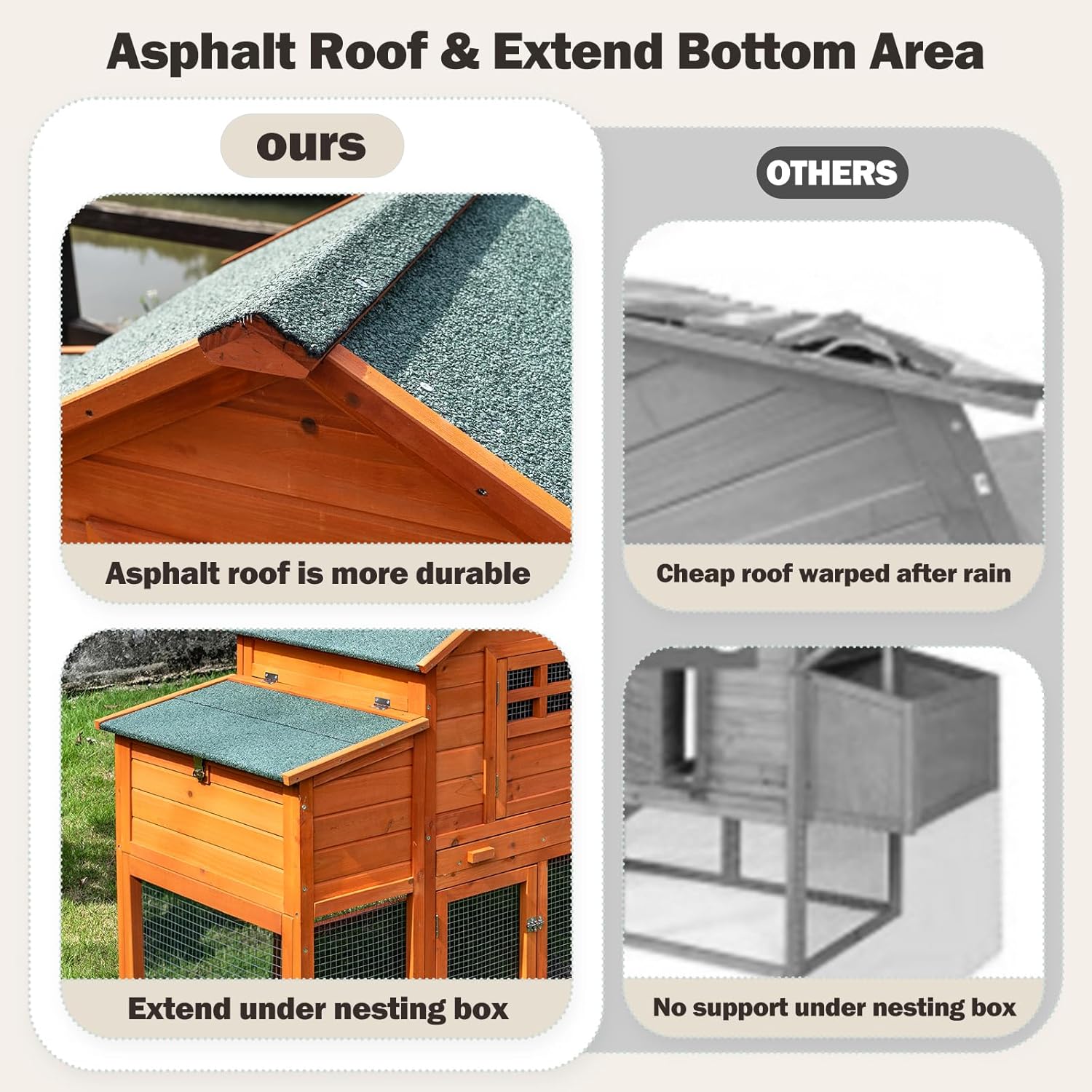 - 【Durable & Weatherproof Construction】Built with solid fir wood and a waterproof asphalt roof, this coop withstands rain, snow, and UV rays. The eco-friendly painted finish protects against rot and pests, while the sloped roof prevents water pooling. Ideal for year-round outdoor use!