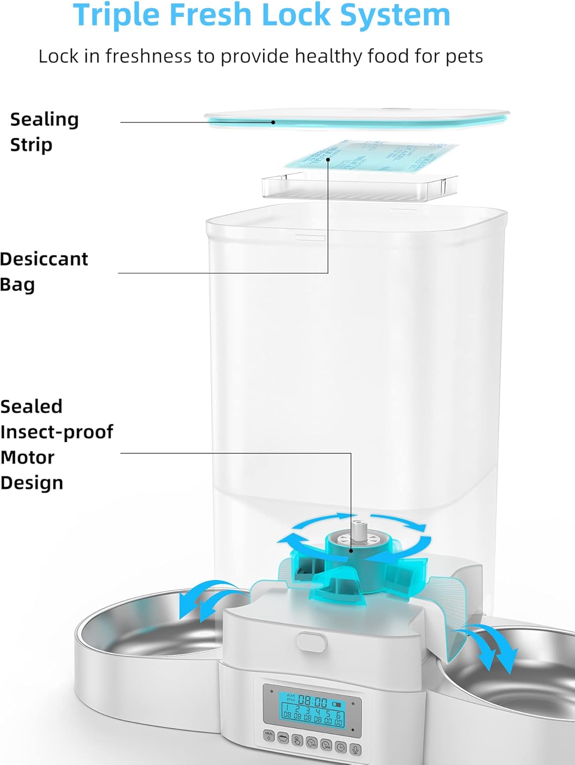 - [Multiple Sealing Keeps Food Fresh] The rubber seal between the lid and the container of the automatic feeder effectively insulates the air to prevent the food from oxidizing and prevents the smell of your pet's food from escaping. There is also a desiccant bag on the lid to dehumidify and prevent moisture. The unique sealed revolving door design in the feeder automatically closes the feeding port after each feeding is completed, preventing ants and insects from entering