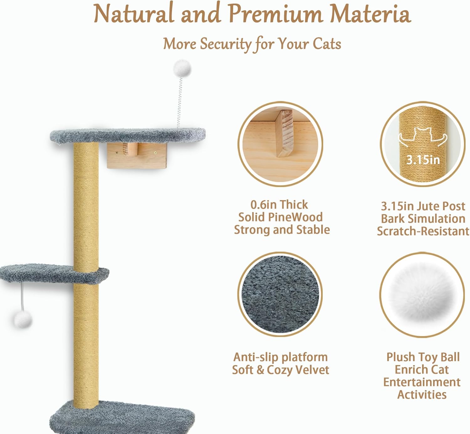 - Plush-Covered Platforms for Cozy Landings: Crafted with pine wood and wrapped with jute rope, the frame offers durability and scratch resistance. Each level is topped with soft grey plush cushions—comfortable, warm, and anti-slip, ideal for napping after playtime. The materials are gentle on paws yet tough enough for daily activity and climbing.