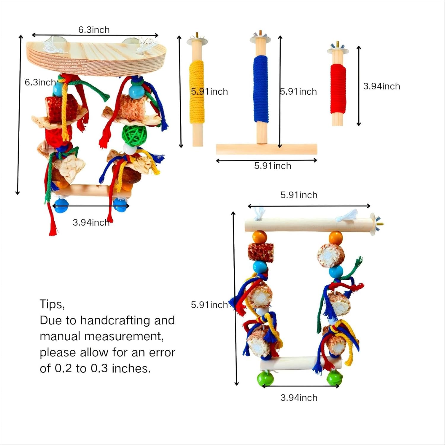 - 【Perfect for Small Birds】Designed for budgies, parakeets, cockatiels, and other small to medium birds, these Bird Perches offer a comfortable resting spot and playful activities. The bird cage hanging toy encourages movement, while the chew toys help maintain beak health. Suitable for both cage and free-standing use, keeping your pet active and engaged.
