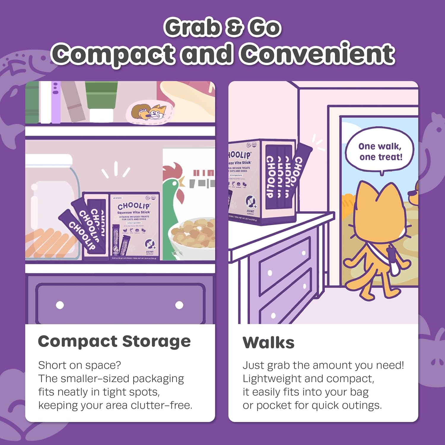 - COMPACT DISPENSER PACK: This Joint Support pack includes 49 sticks to treat your cat or dog. It’s perfect for quick, grab-and-go use, easy to carry in a bag for trips, or convenient to keep near your pet supplies.