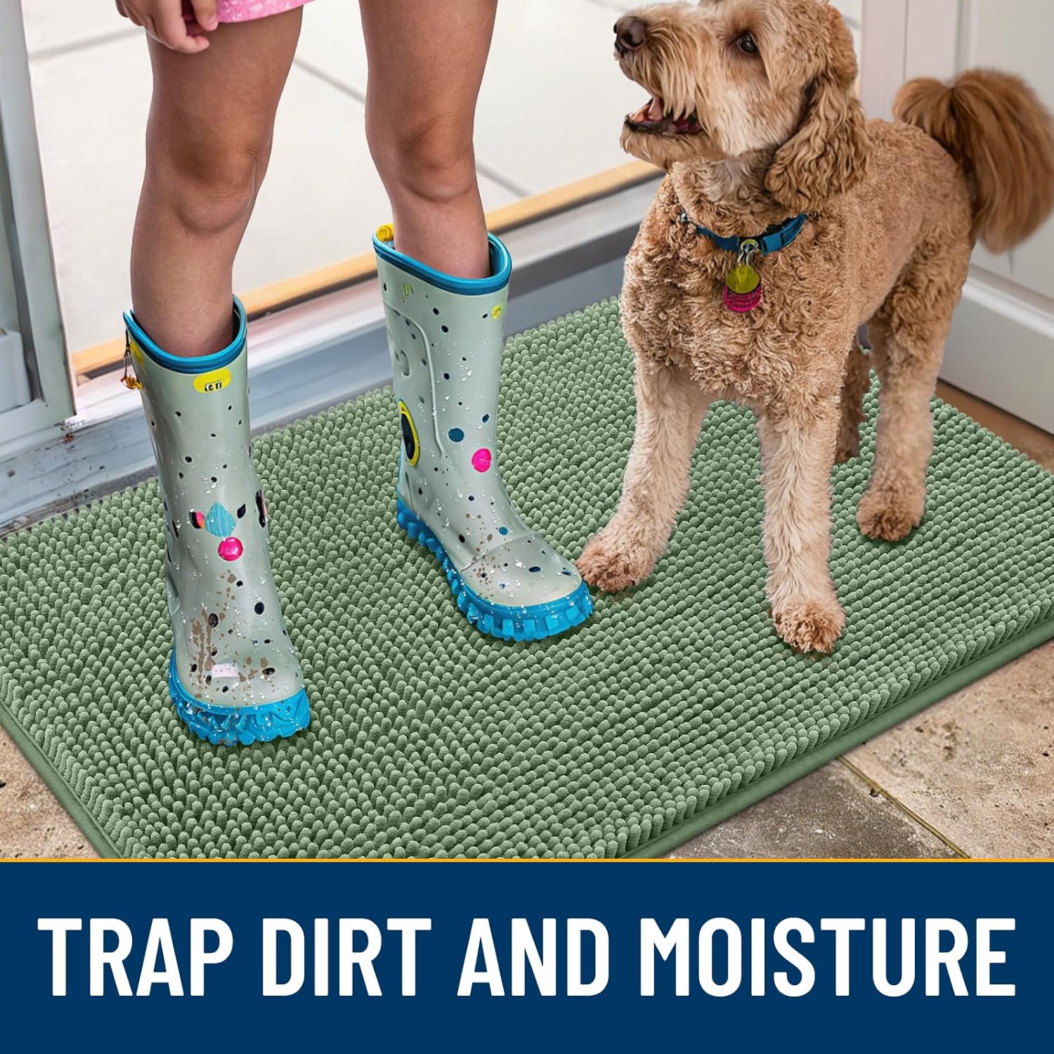- [Absorbent and Dirt Trapper] High-density chenille dog mat, super absorbent and dirt-catching, whether wet after shower, muddy or moisture bring back by dogs, it can absorb well, so that you and your favorite pet can say goodbye to the wet and mud. It's an excellent choice for use as an entryway door mat, a welcome door mat or a dirt-trapping door mat.