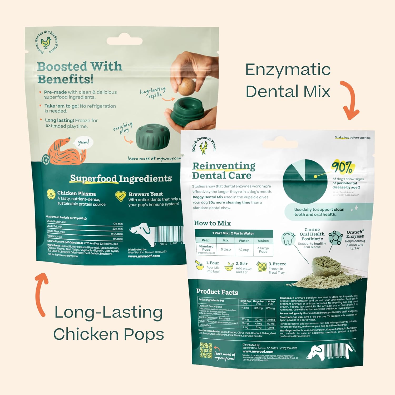 WOOF Dental Kit- Includes Pupsicle Dog Toy, Treat Tray, Shaker Bottle, Chicken Pupsicle Pops, and Dog Teeth Cleaning Powder - Supports Oral Health for Dogs - Large