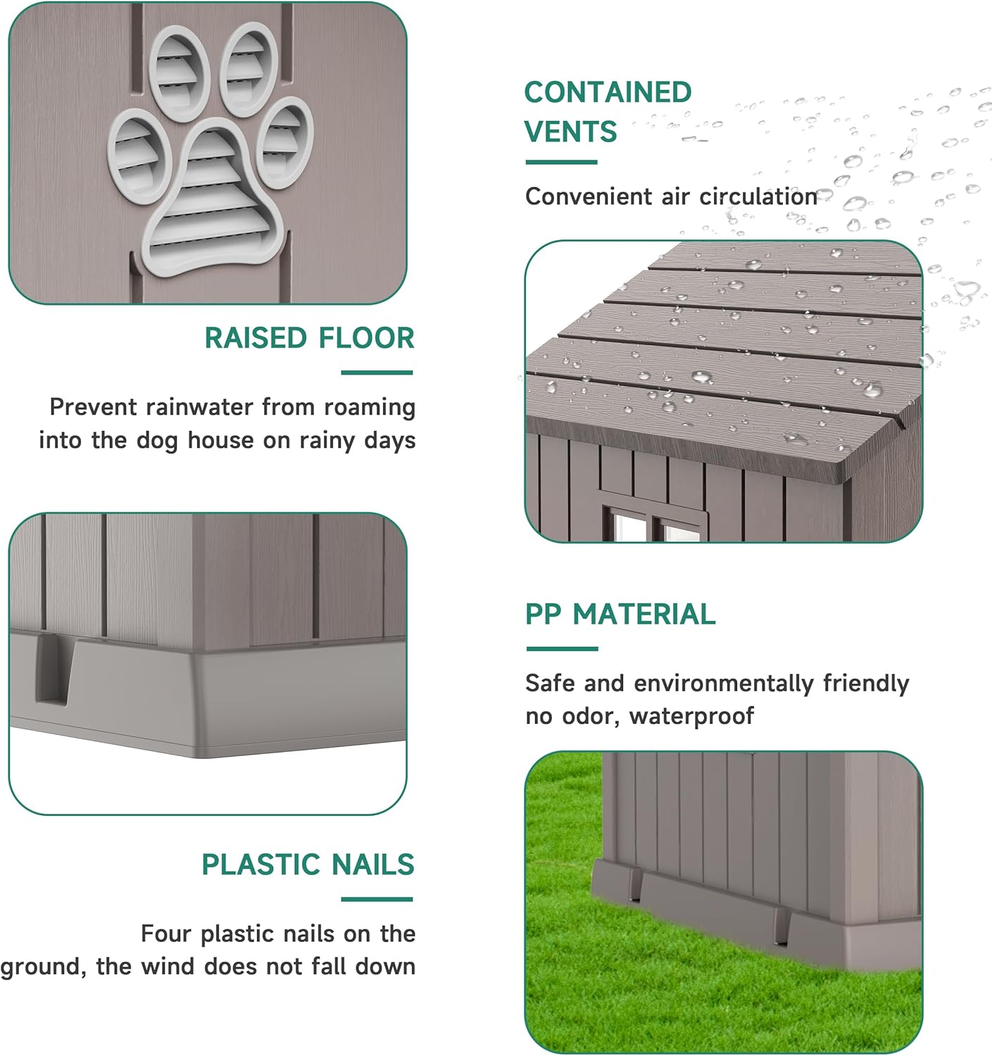 Vixzen 32in Large Outdoor Dog House,Durable Water Resistant Resin Dog House,Doghouse for Small to Large Dogs Indoor or Outside,with Air Vent and Elevated Floor,Gray