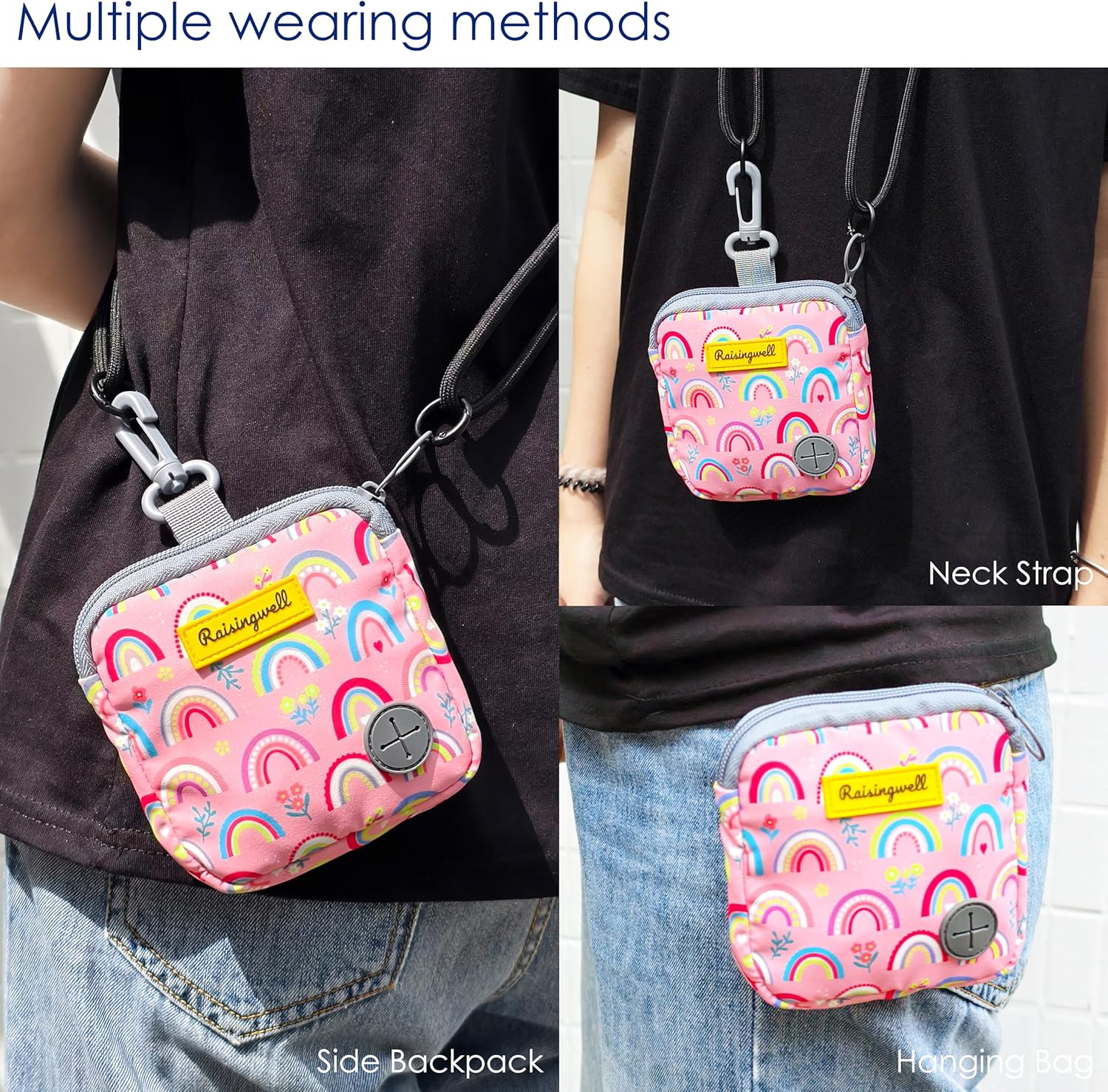 - Raisingwell Dog T1、Fashion Design: This dog training treat bag measures 4.9 x 5.1 inches and offers versatile wearing options. It comes equipped with a carabiner and a strap, allowing you to hang it on your leash, attach it to your pet's collar, or even wear it as a trendy accessory on your bag. The bag features a zipper closure, ensuring that treats stay secure inside even when you're playing with your pet afterward. It's perfect for carrying around or using during short outings.reat Pouch