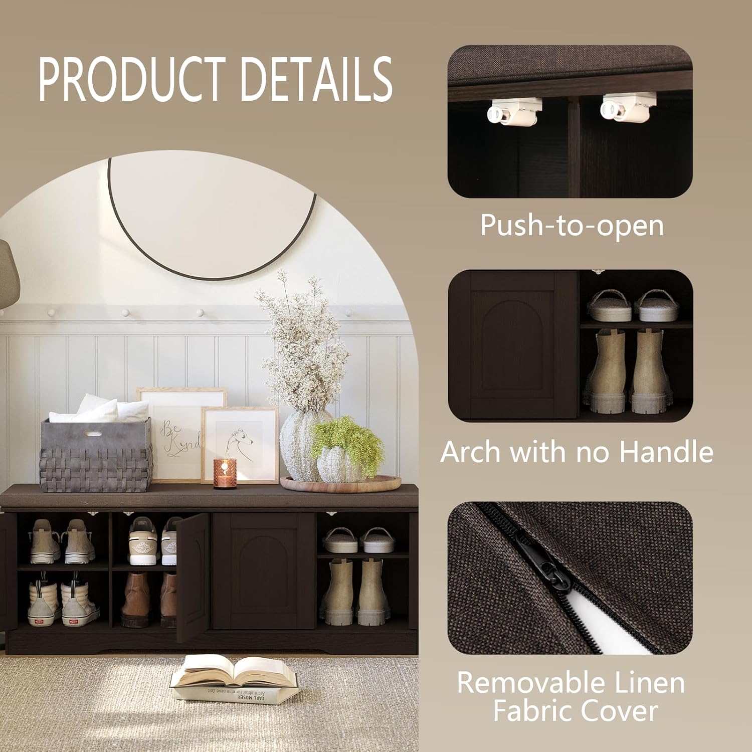 - 【Effortless Push-to-open Door】Feature a fully enclosed design with a press-to-open mechanism, keeping shoes clean and tidy while avoiding accidental bumps against door handles during use. Reasonable height and soft cushion let you change shoes by sitting on the bench more comfortable without bending down or squatting