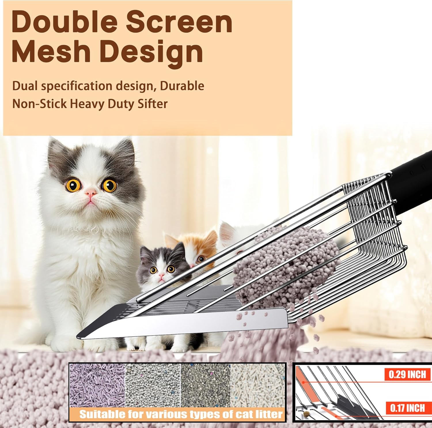 - 2. Efficient Double-Layer Sieve for Quick Filtration: This cat litter scooper features a dual-layer design with large and fine holes, effortlessly separating clumps from various types of litter (bentonite, silica, or crystal and so on). The angled design reduces the need for repeated shaking, minimizes scooping repetitions, and reduces dust, allowing for quick and hygienic cleaning with this litter box scooper