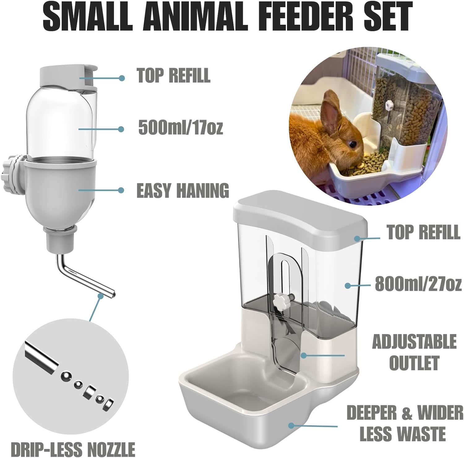 Automatic Pet Food Water Dispenser, Auto Gravity Pet Feeder Water Bottle Set for Crate Cage, Feeding Station for Small Dog Cat Rabbit Guinea Pigs Chinchilla Ferret Hedgehog (Gray)