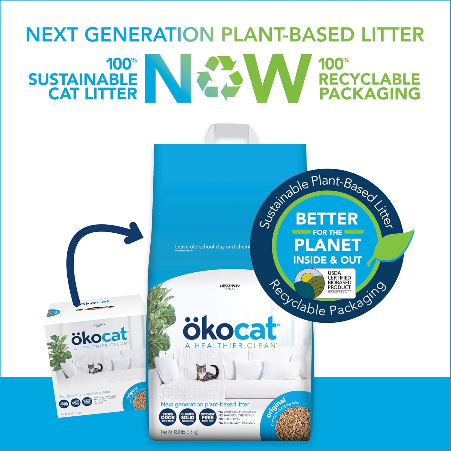 - 100% recyclable paper packaging contains the same great okocat litter but is now easier than ever to open, store, break down and recycle.