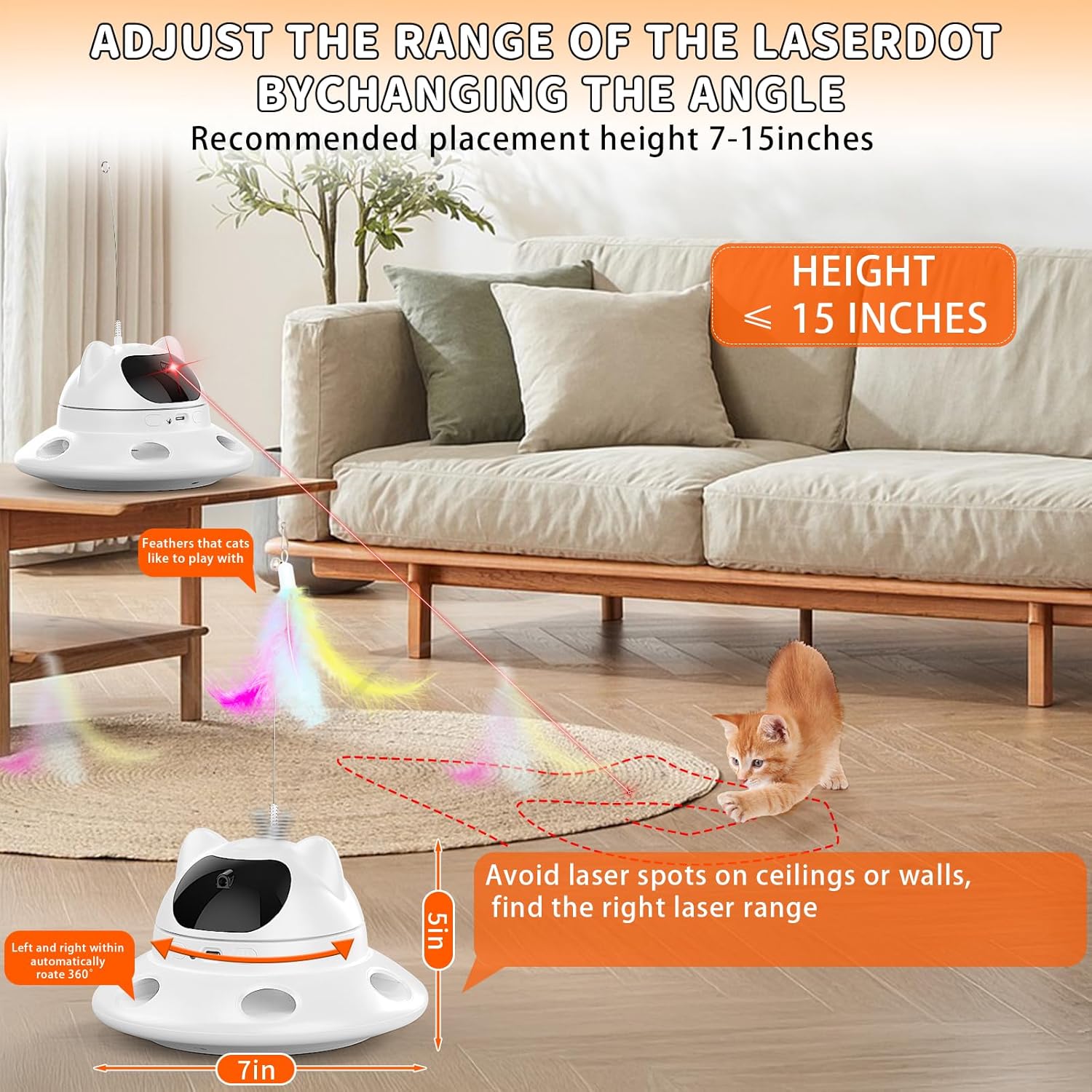- 🎯 3-in-1 Cat Laser Toys Unique dots, stars, butterflies, mice, smiling faces, laser patterns, automatic 360 ° random laser trajectory, unpredictable red laser motion stimulates cats to chase and play. The head teasing cat stick bell feathers attract cats to slap, and feathers are randomly shot out from 6 holes to encourage your cat to pounce and slap. Perfectly matched with various scenarios, there is no need to worry about indoor cats hitting anything that may fall or break.