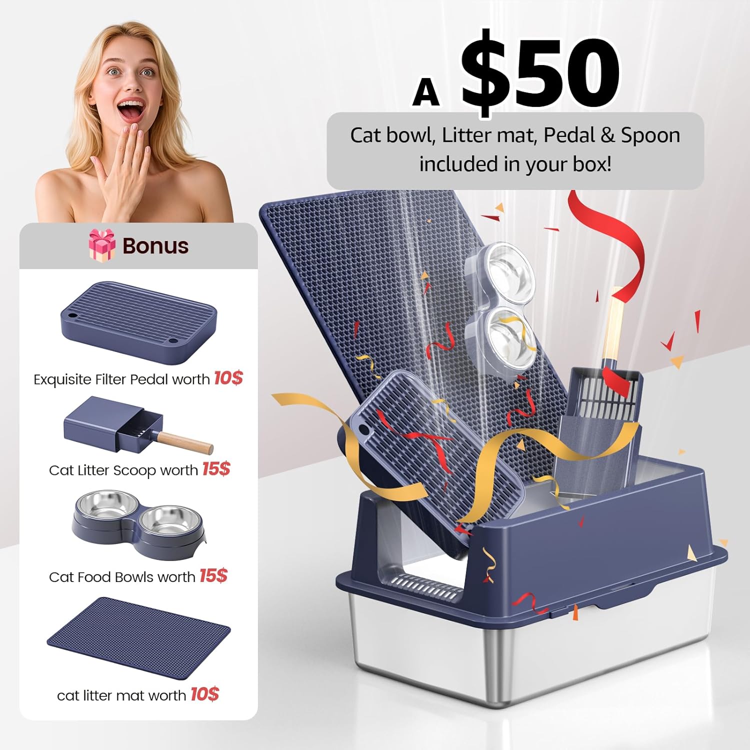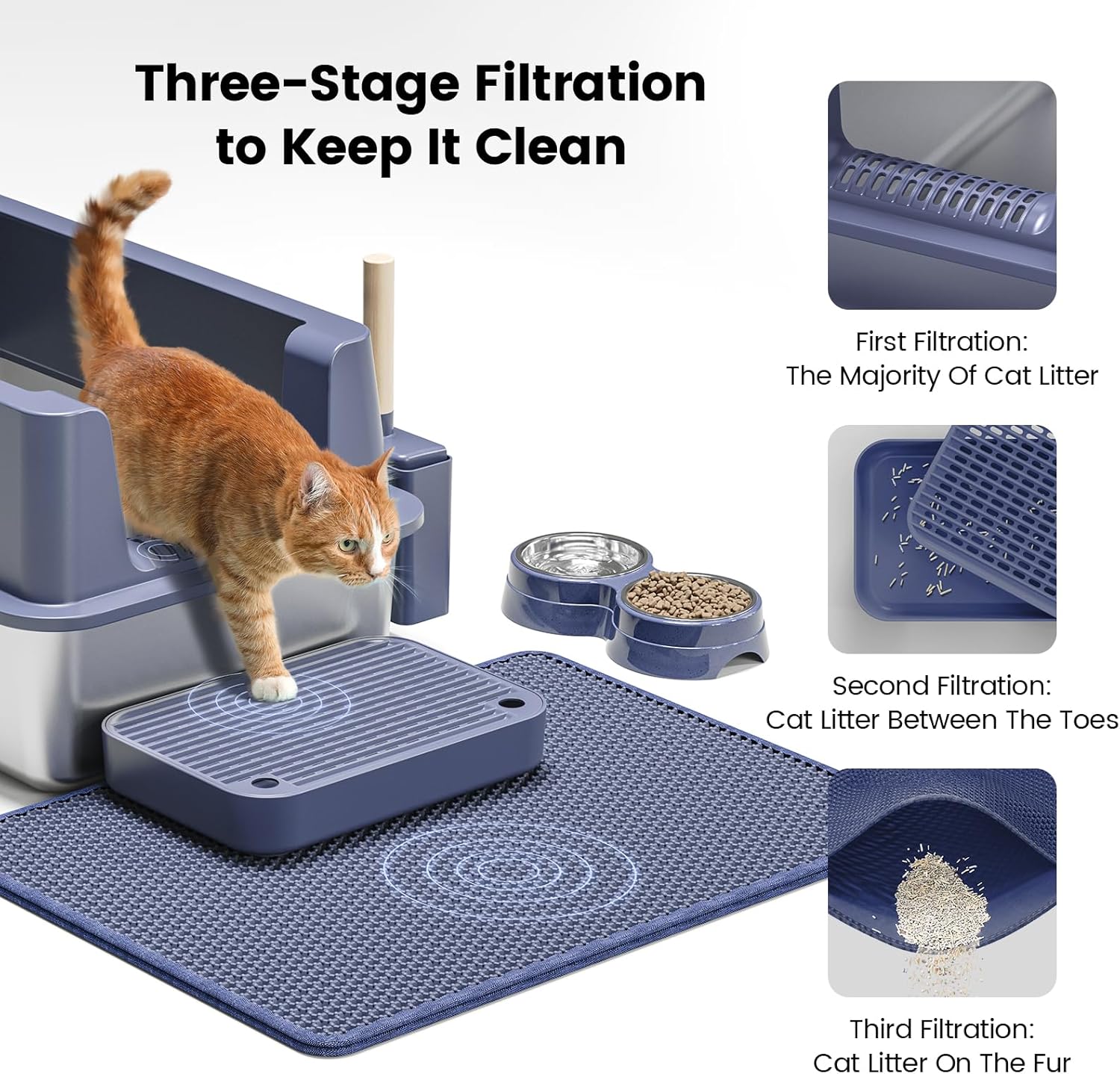 - 【UPGRADED DESIGN, DOUBLE CAPTURE】Our metal litter box now features a refined pedal with a built-in litter mat for enhanced litter trapping, plus an added cat bowl for convenience. The redesigned footboard ensures easy access for all cats, from kittens to seniors, making it perfect for their natural habits. It’s a smarter, cleaner solution for your feline friend!