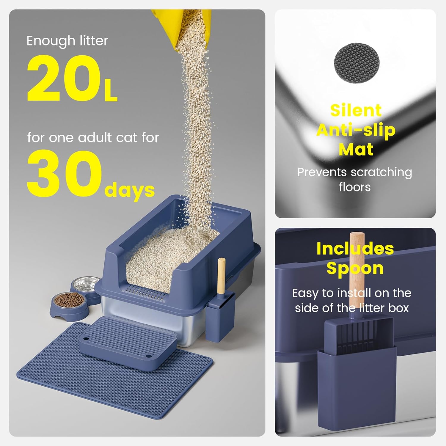 - 【EXTRA LARGE CAT LITTER BOX】 Our stainless steel cat litter box isn't just spacious; it's also a time-saver. With dimensions of 23.6" x 16" x 12", it offers an expansive realm for cats of all sizes. Plus, with its 20 liter capacity, you'll spend less time replenishing litter, giving you peace of mind for up to 30 days to enjoy doing what you love.