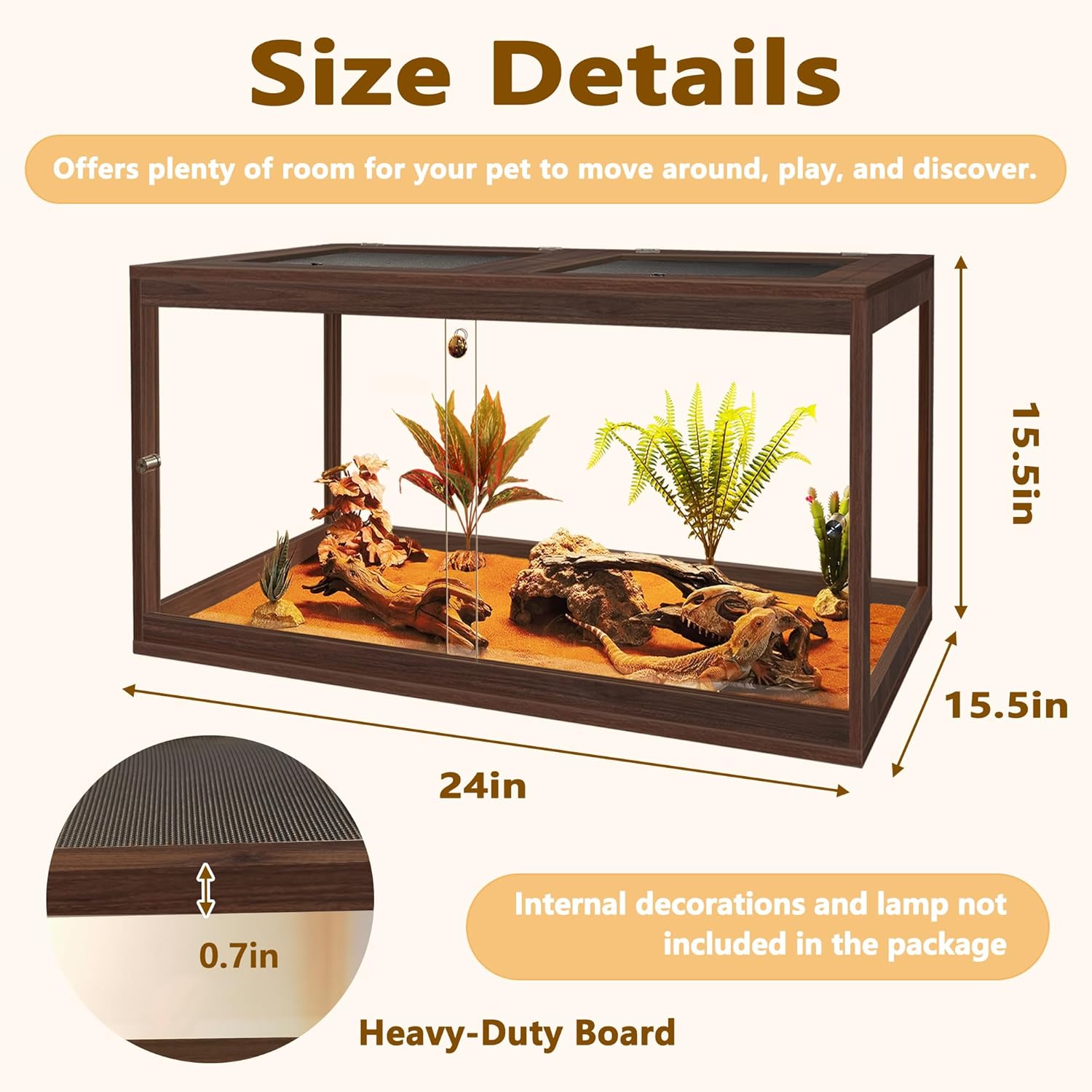 - 【Spacious and Comfortable Interior】Available in four length options (24", 30", 36", and 48"), this enclosure provides ample room for reptiles to explore, bask, and hide. Check the second image for detailed dimensions to choose the right size for your pet. An acrylic bottom liner helps with mess management and simplifies cleaning.