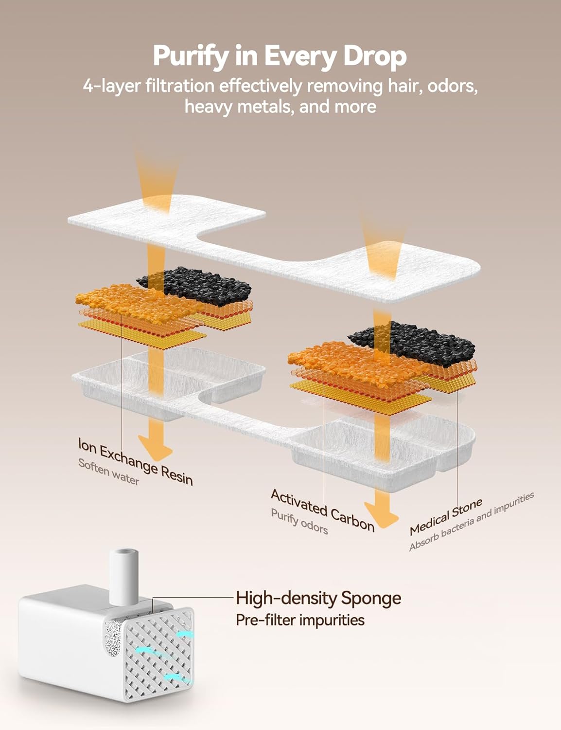 - Fresh Water in Every Sip: The 4-level deep filtration system (high-density cotton, ion exchange resin, coconut shell activated carbon) efficiently intercepts impurities and adsorbs odors, keeping the water source fresh and circulating at all times.