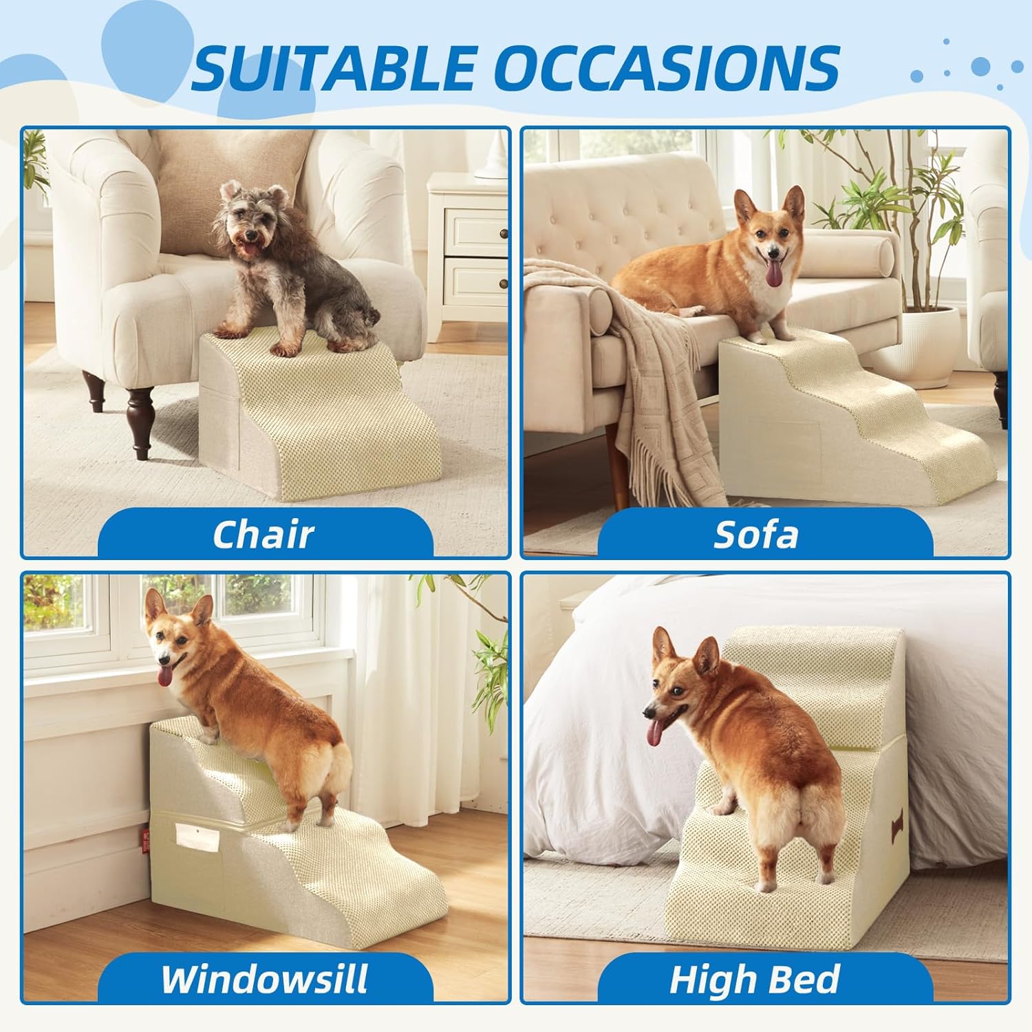Dog Stairs for Small Dogs and Cats, 2 Steps Pet Stairs to Get on Couch Sofa and Chair, Indoor Non-Slip Balanced Portable Pet Step, High-Density Foam Ramp with Removable Washable Cover, Beige(11.8" H)