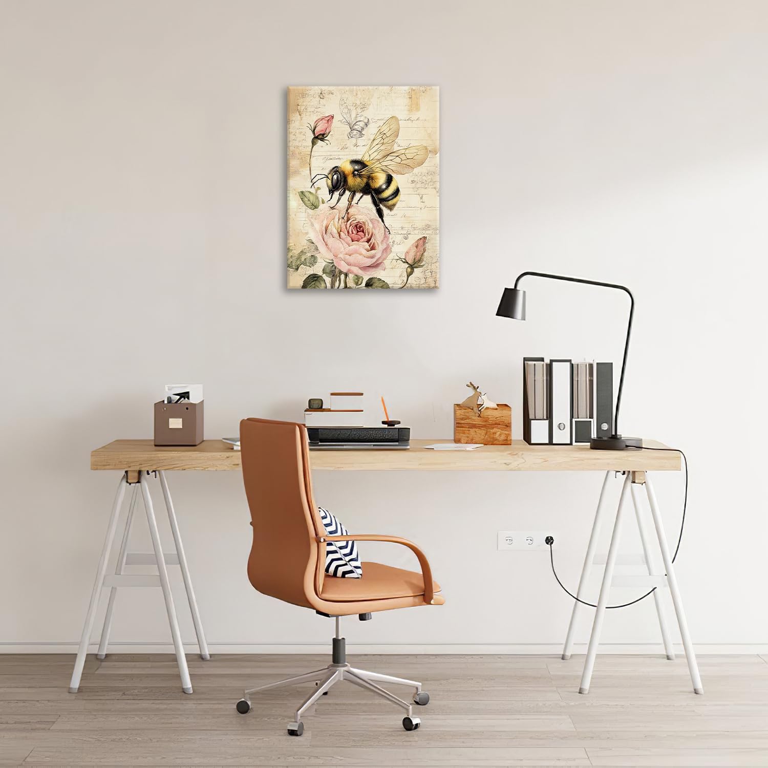Rustic Bee Bathroom Pictures Wall Art, Vintage Floral Bathroom Wall Decor, Pink Rose Flower Framed Painting Canvas Artwork for Bedroom Living Room Decorations 16"L x 12"W