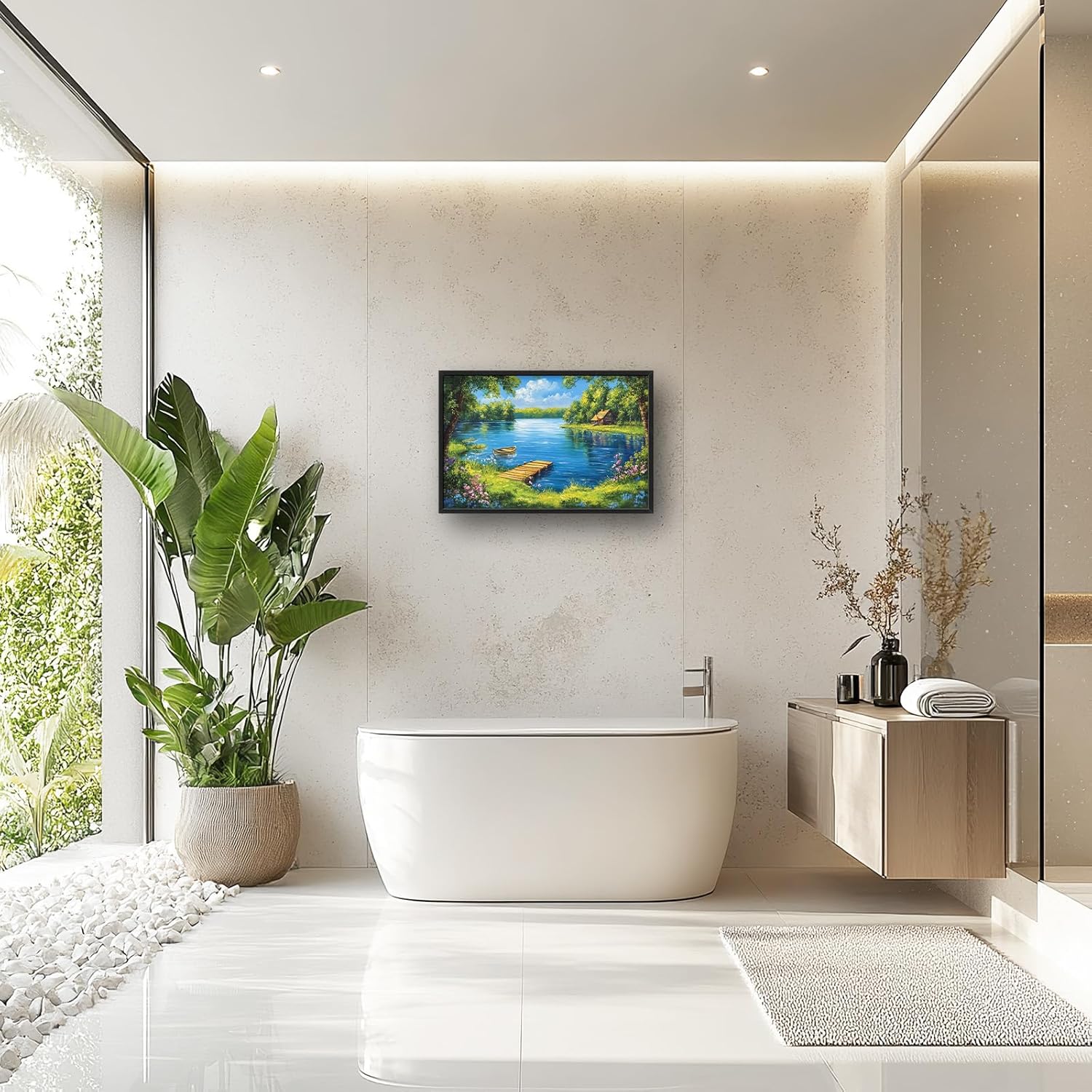 Large Lake Cabin Wall Art for Living Room, Framed Oversized Tree Boat Wildflowers Wall Decor Nature Landscape Canvas Painting Modern Artwork for Bathroom Bedroom Office Dining Room 36"x24"